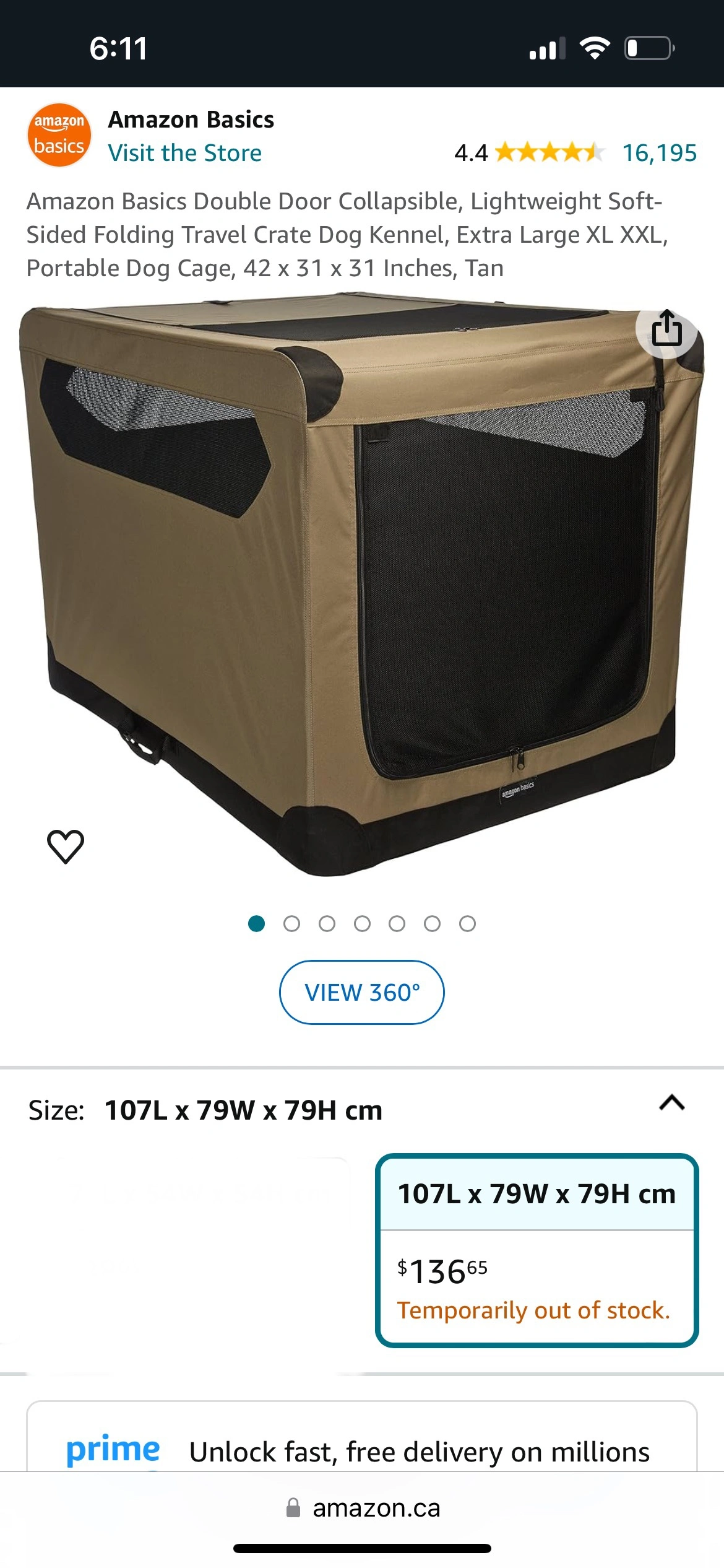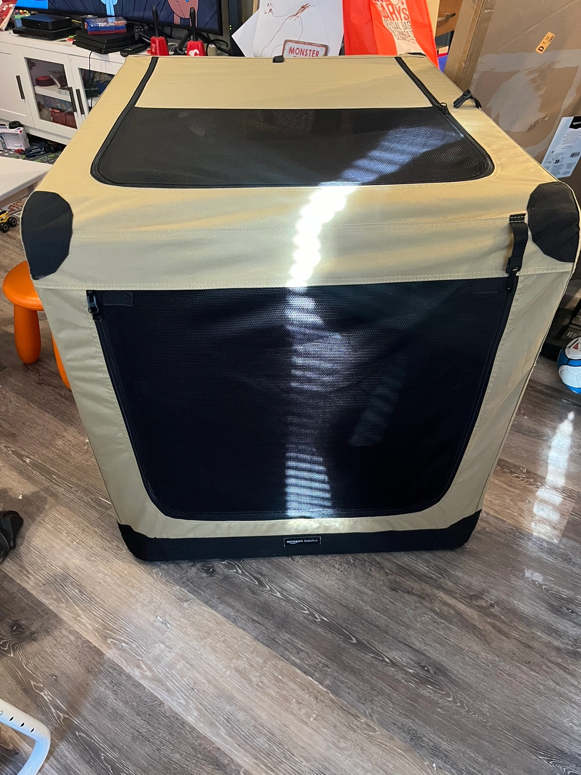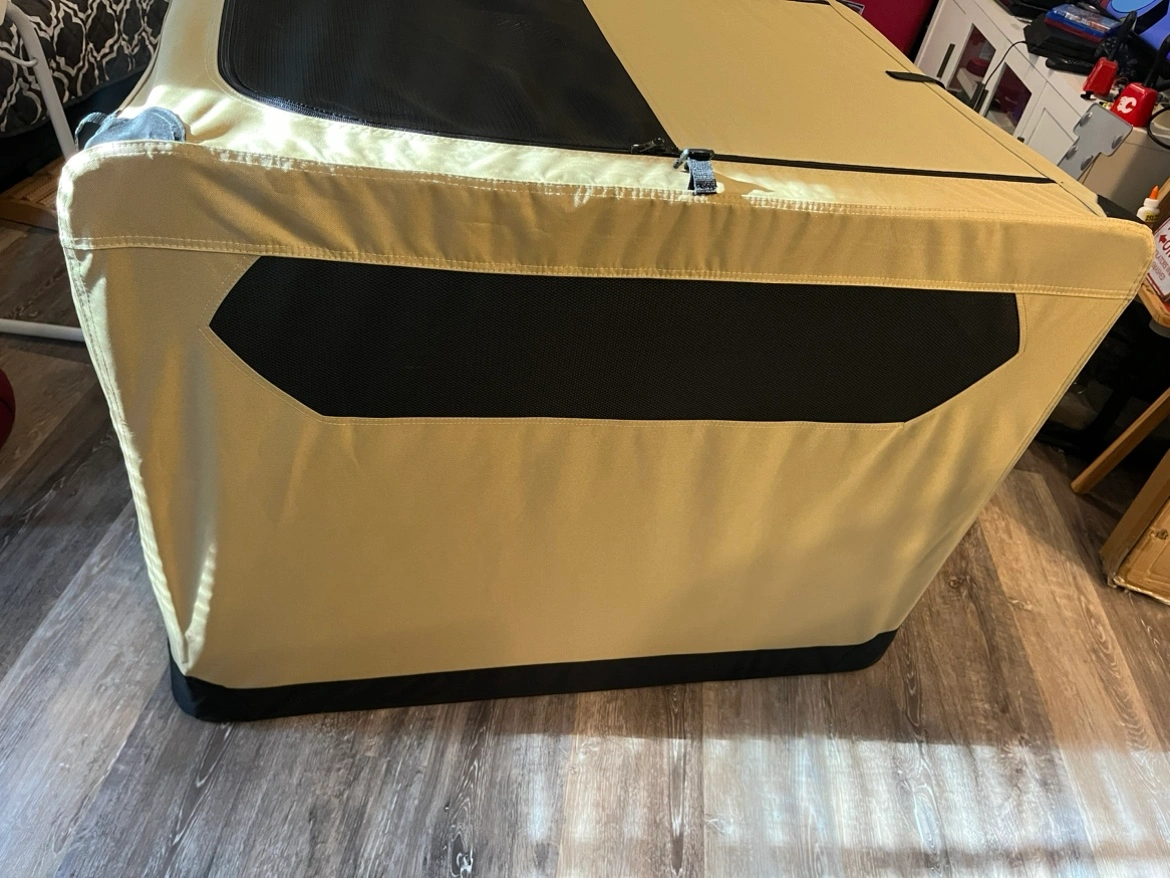 A foldable dog crate in beige and black. It has a mesh door and a zippered door. It also has a mesh panel on the side. The crate is in excellent condition as it has never been used.