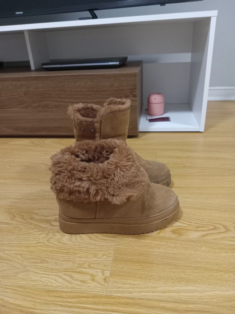 Women's brown suede winter boots with faux fur trim around the top. The boots have a platform sole and a buckle detail on the side.