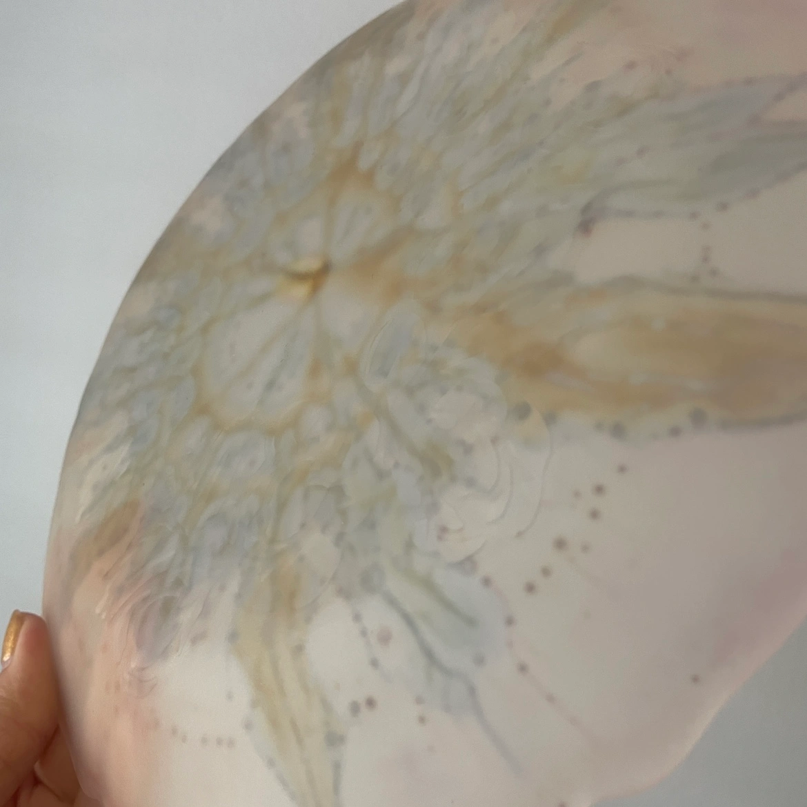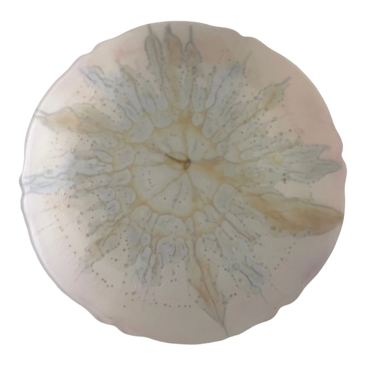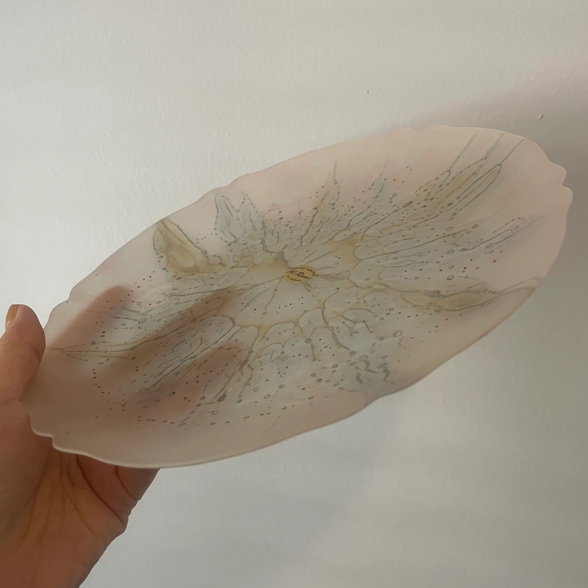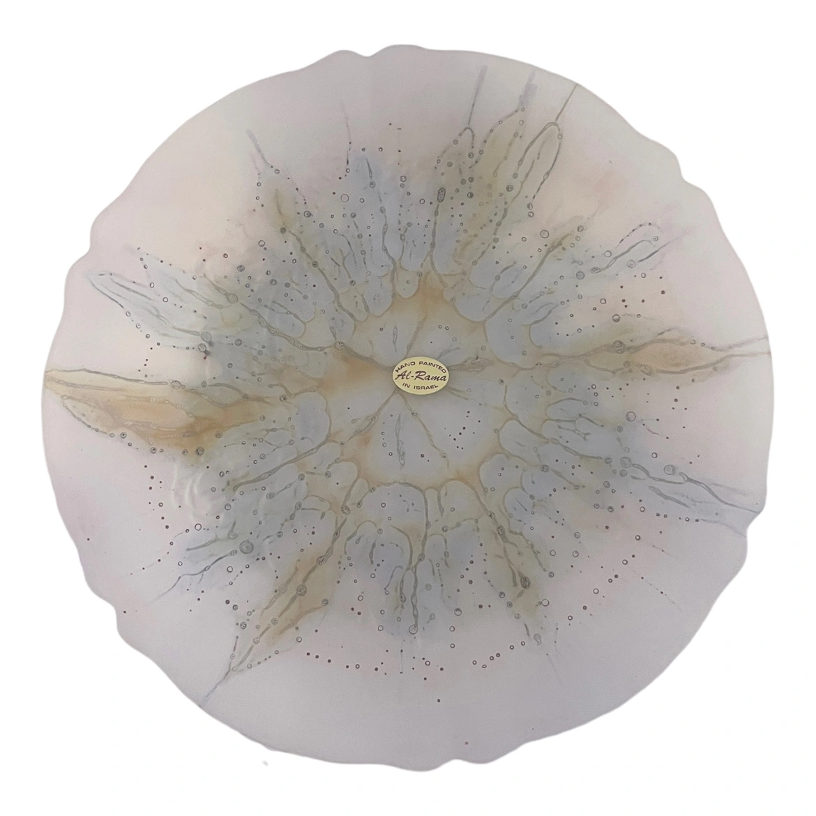 Gorgeous vintage frosted glass plate has a a floral design and is hand painted by Al-Rama artists in Israel. Plate has beautiful coloured details and original sticker.