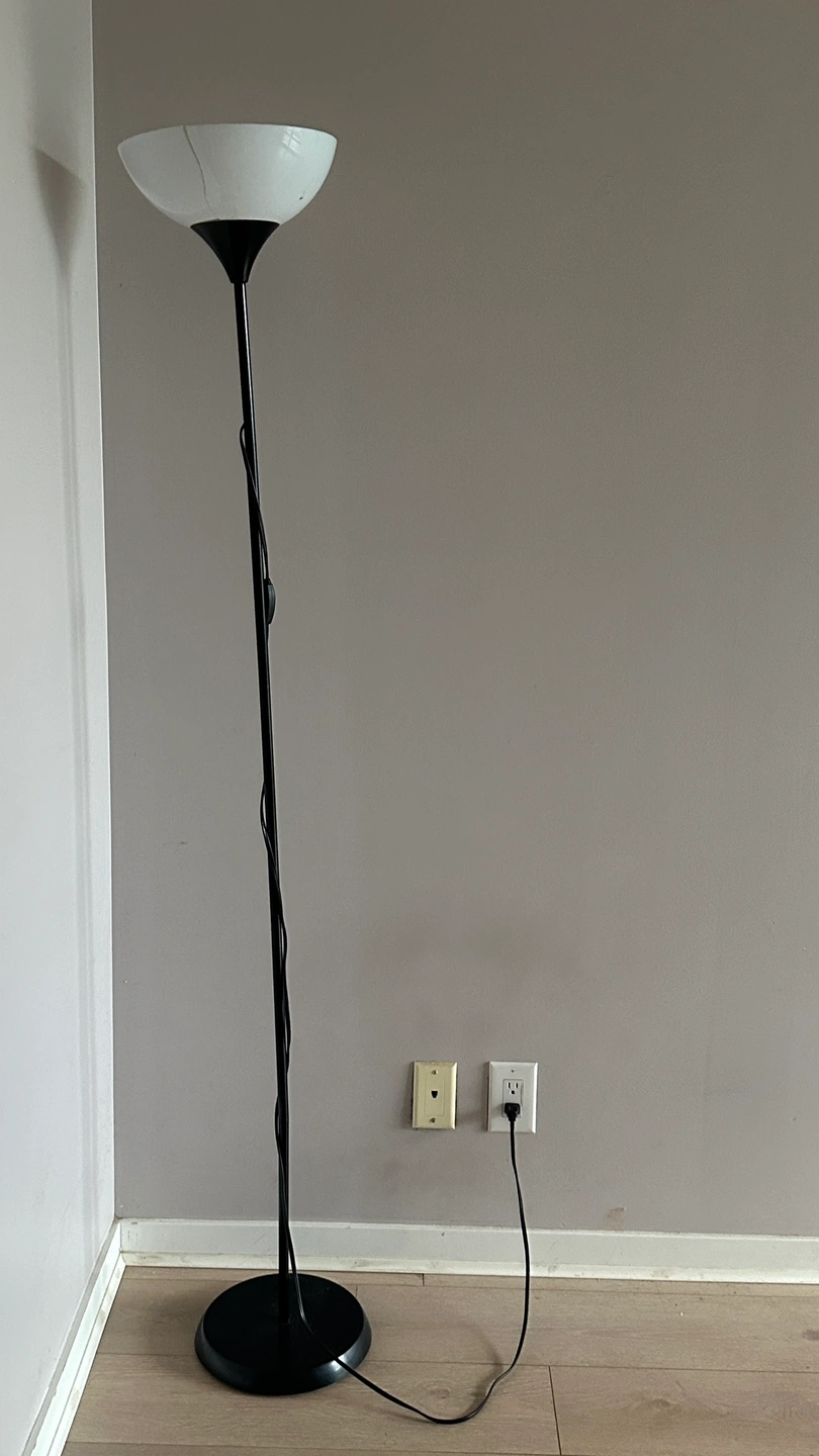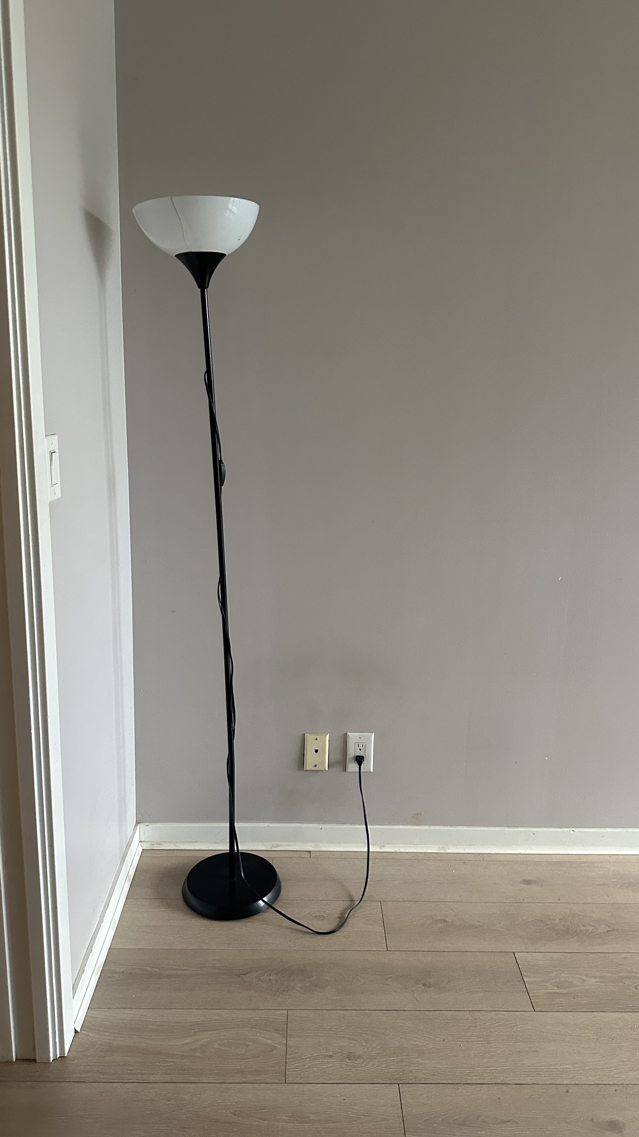 Black floor lamp with white shade. The lamp is in good condition. It is fully functional and is ready to add some light to your space!