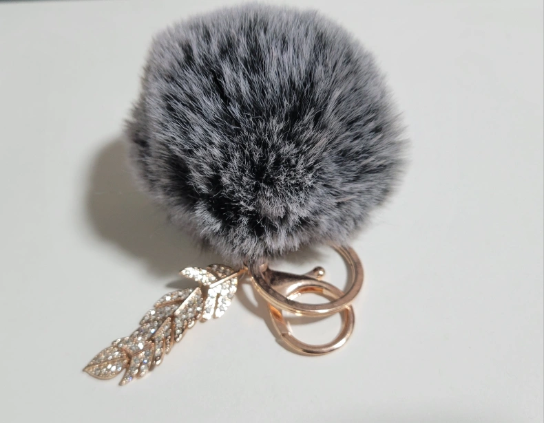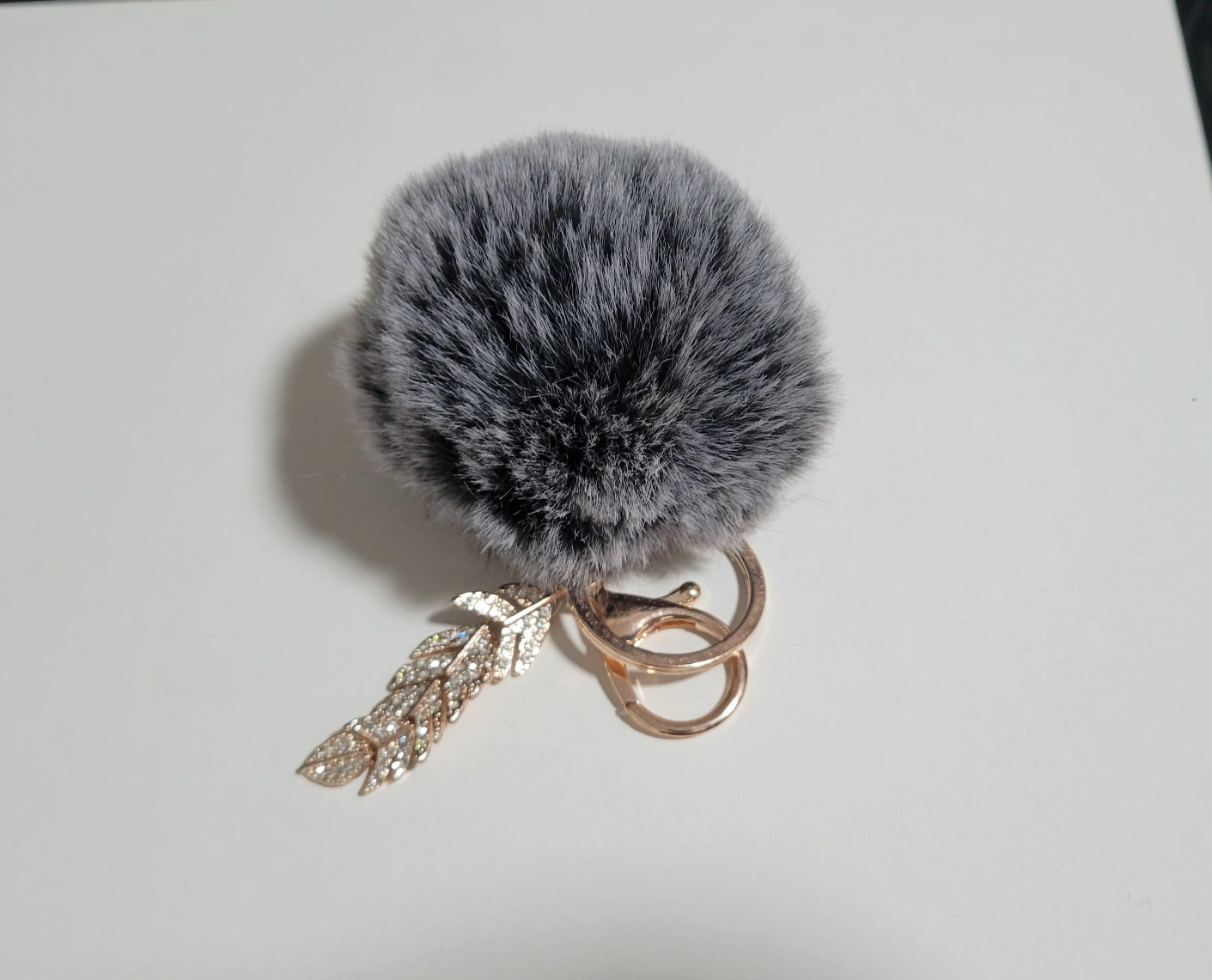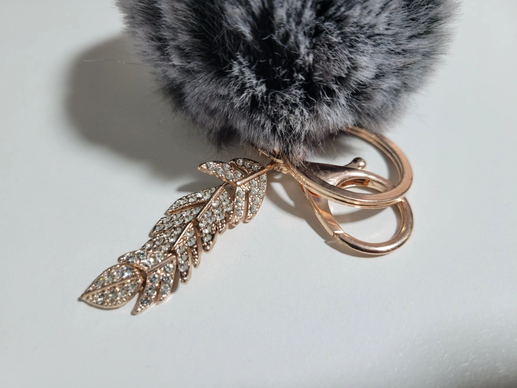 A grey furry pom pom keychain with a gold leaf charm with rhinestones. Cash only Pick up only
