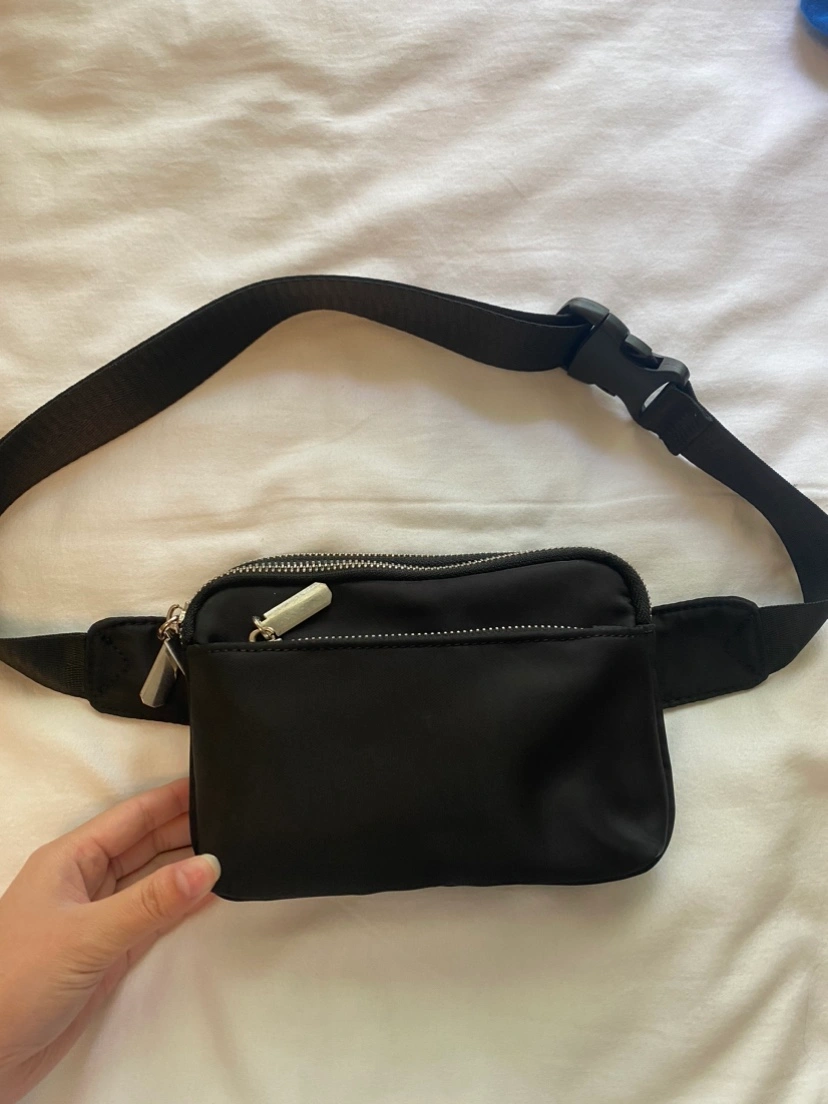 Black fanny pack with adjustable strap and multiple zipper compartments.