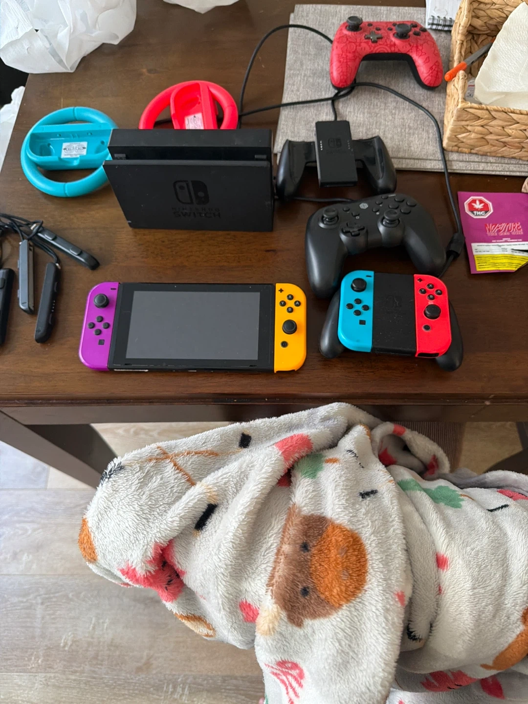 Nintendo Switch console with two sets of Joy-Cons, extra controllers, and steering wheel accessory. Includes Sonic Frontiers and Mario Party Superstars games. It's ready for gaming fun!