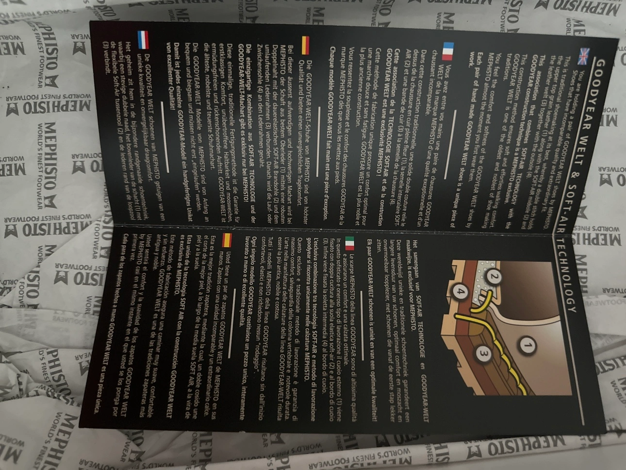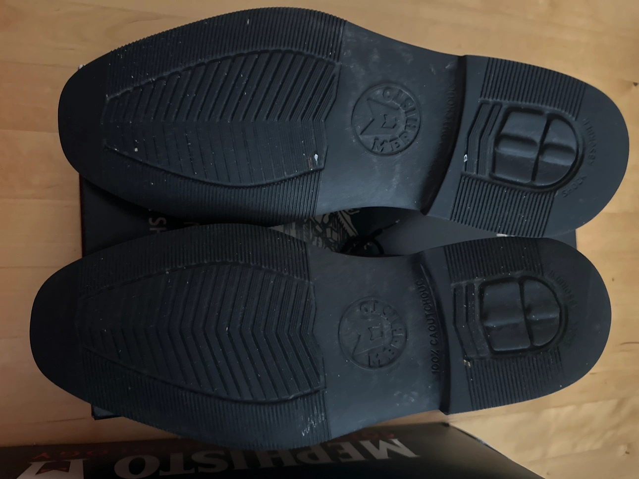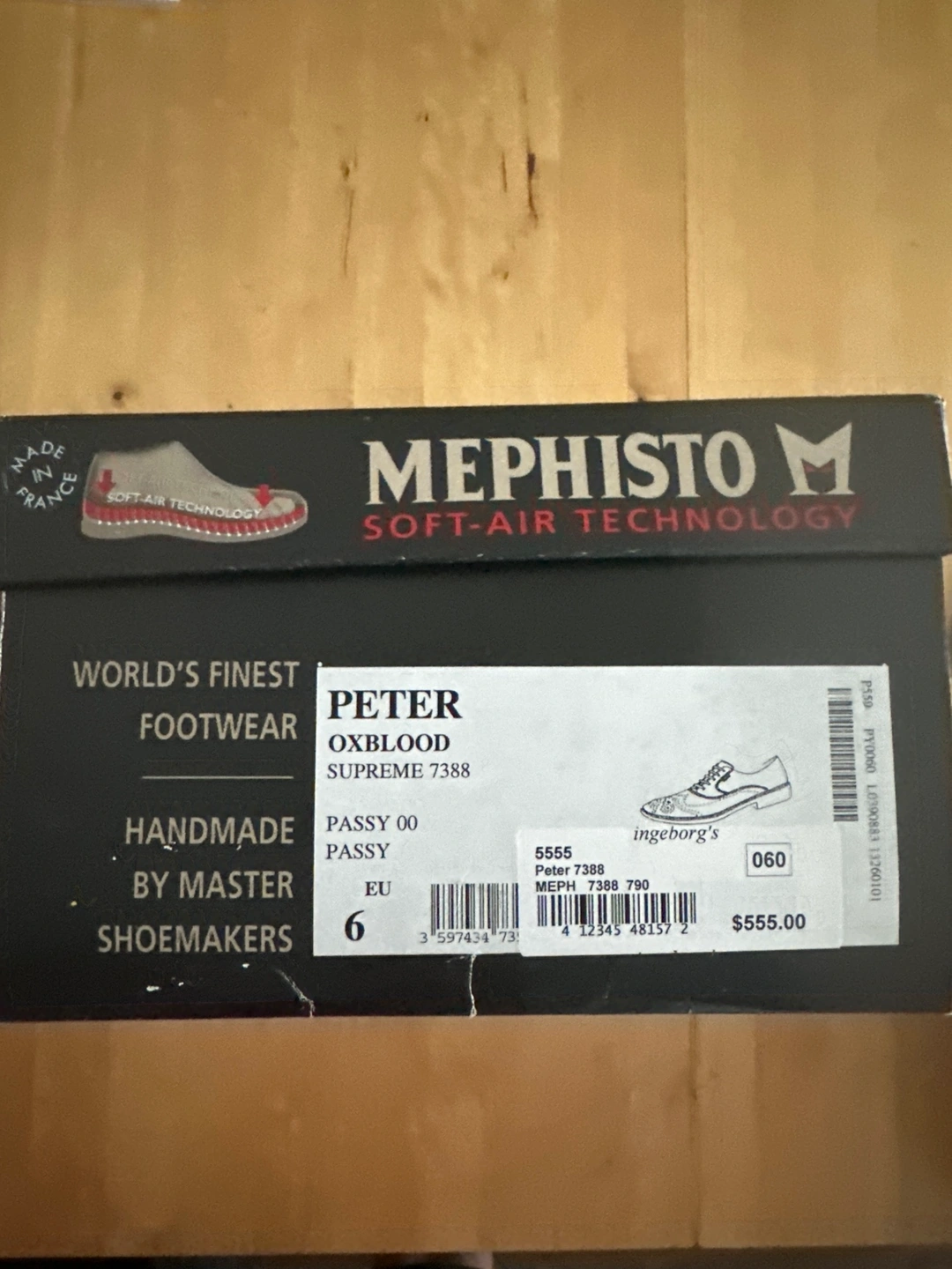 Men's size 6EU & 8 US. Made in France. Genuine leather upper and insole. Goodyear welt construction. Includes original box and Mephisto Shoe Bag .