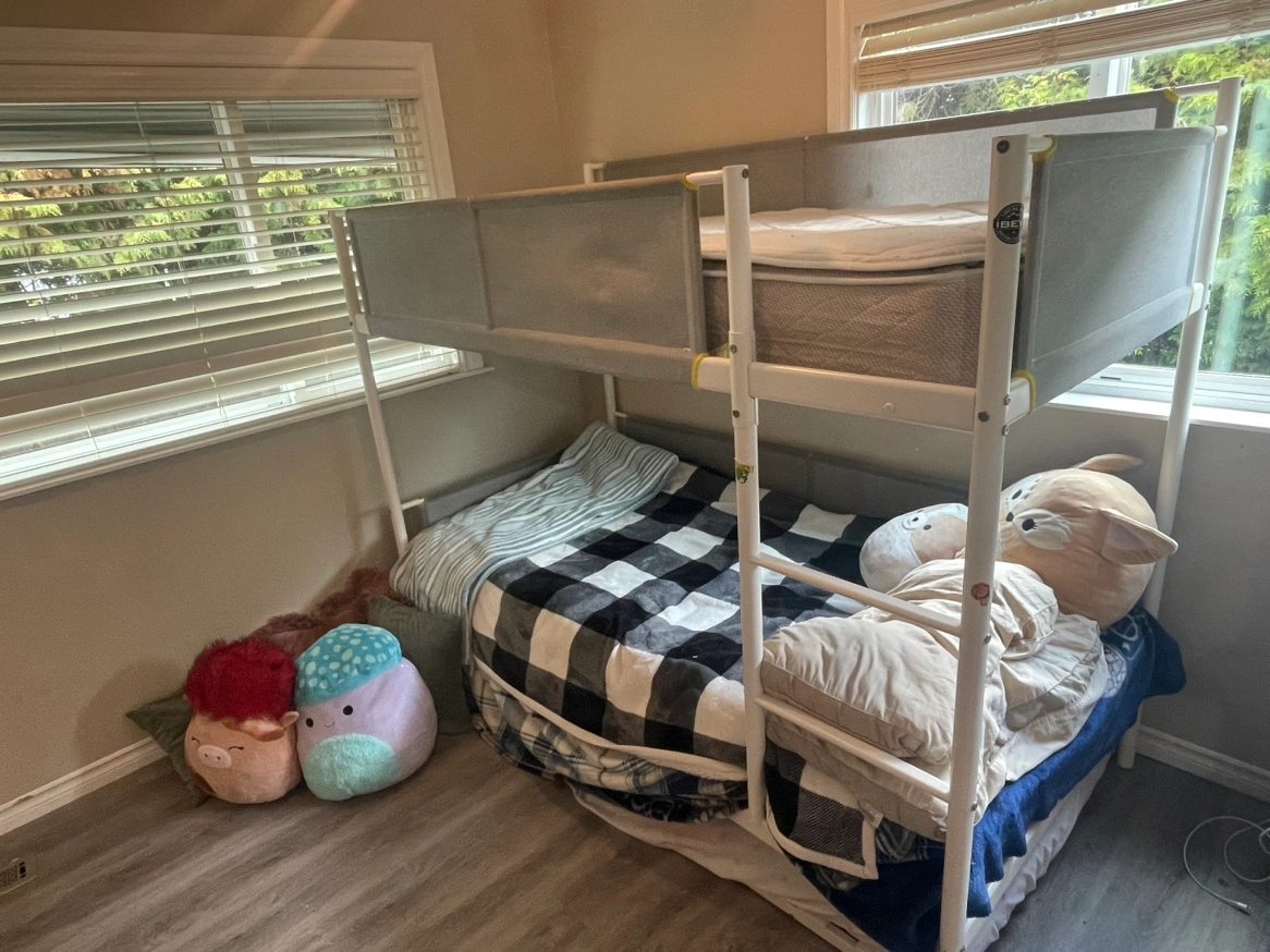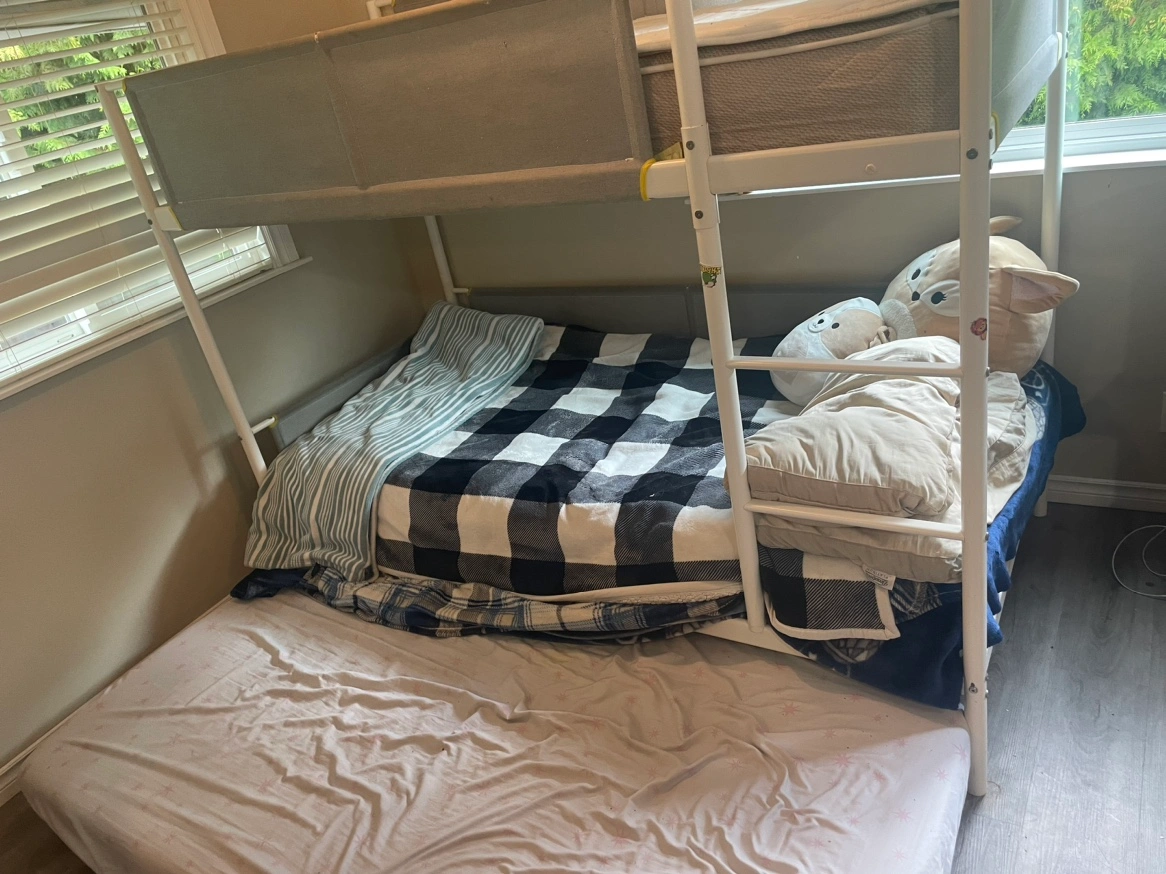 This bunk bed comes with a trundle. The top bunk has a guard rail. It has been disassembled and is ready for pick up. All three mattresses are included.