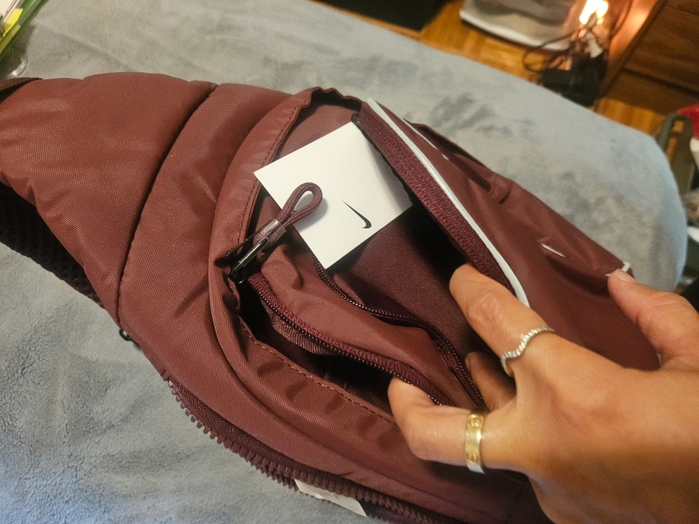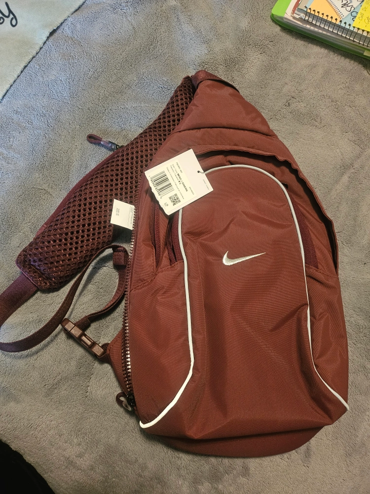This is a Nike maroon crossbody bag with a zippered pocket and mesh on the back. It has a white Swoosh logo on the front. The bag is in good condition.