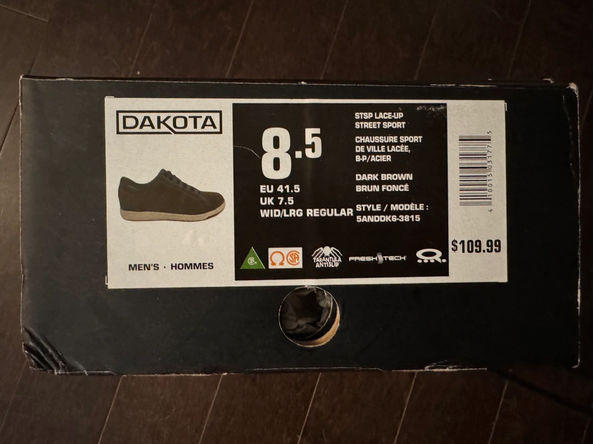 These are a pair of men's Dakota steel-toed shoes. Mostly brown with some black. They look like sneakers and are size 8.5. They are in great condition. Only worn a handful of times to visit a site.