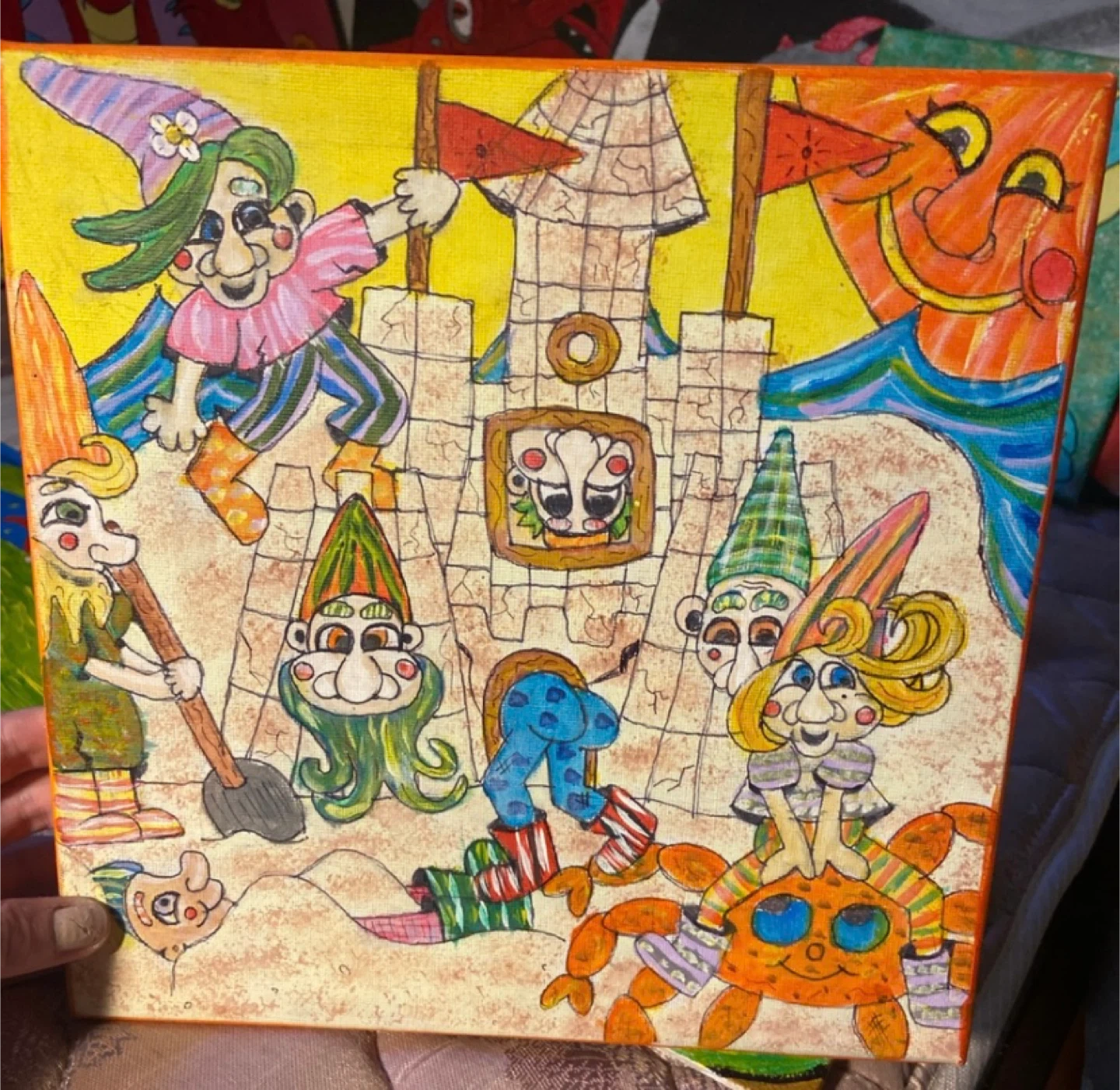 A unique, hand-painted canvas featuring whimsical gnomes building a sandcastle under a smiling sun. This vibrant piece is a great addition to any playful decor. Perfect for adding a touch of fantasy to a room!