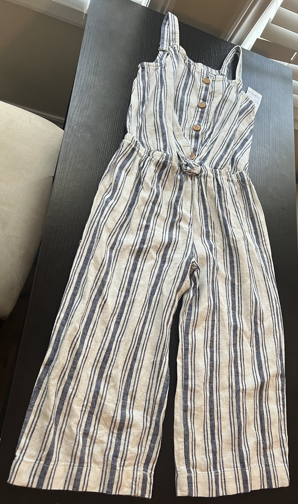 *firm price* Selling a brand new striped jumpsuit that is sleeveless with a button up front, and wide leg crop style-for girls in size 6X. This has never been worn. Unfortunately, my child didn't get the chance to wear it.