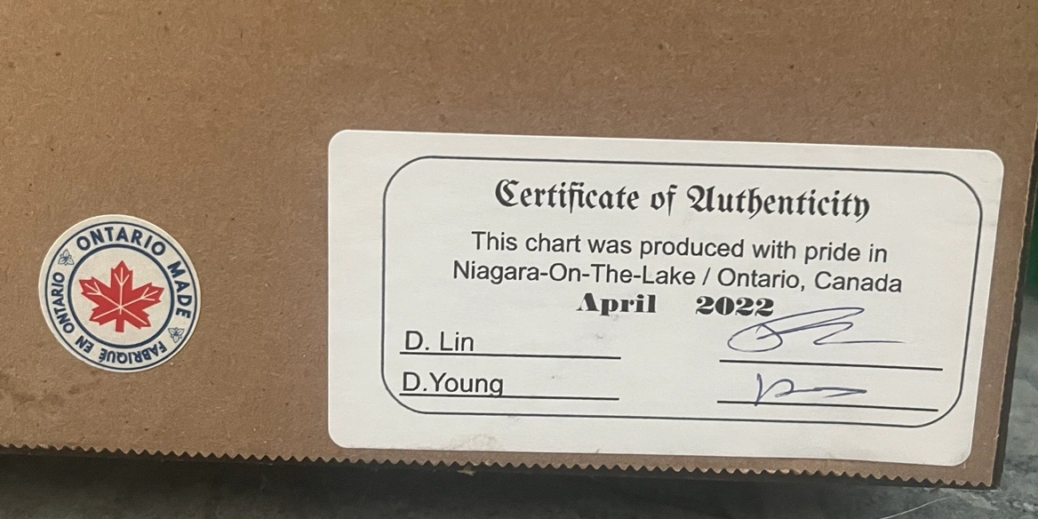 The map is secured in a frame, behind glass, and is ready to be mounted and displayed on the wall. The map also comes with a certificate of authenticity.