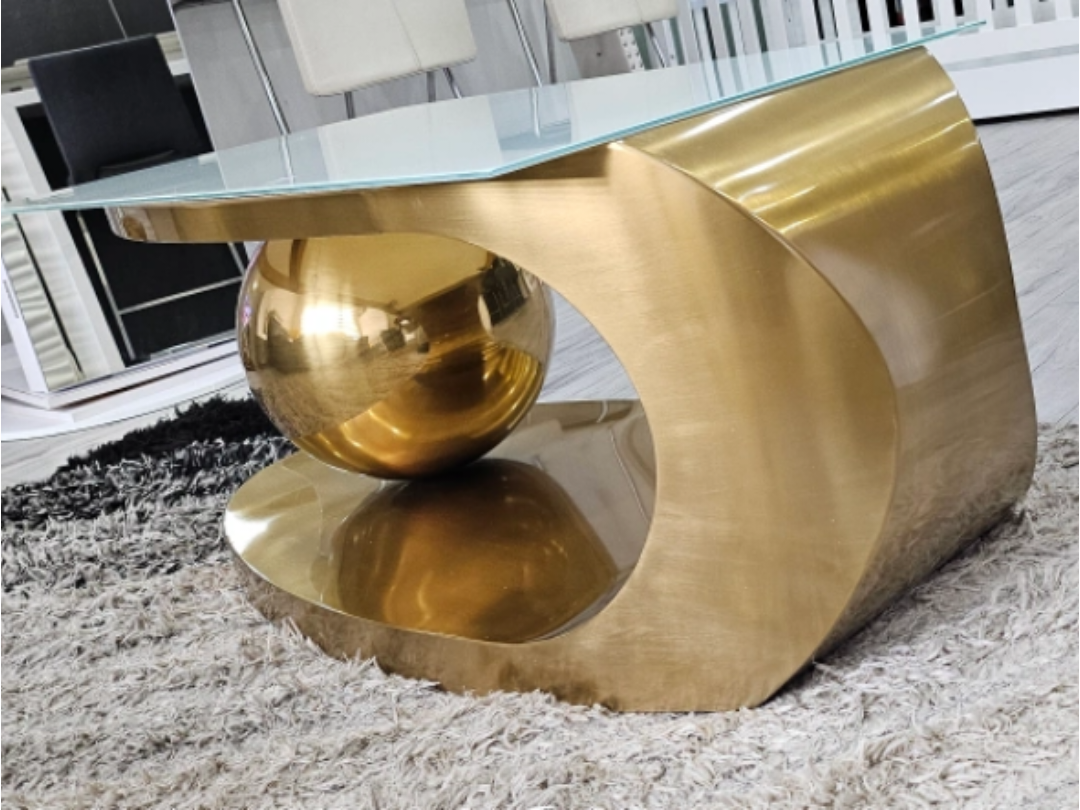 This is a beautiful gold coffee table with a unique design featuring a large sphere in the base. The top is made of glass.