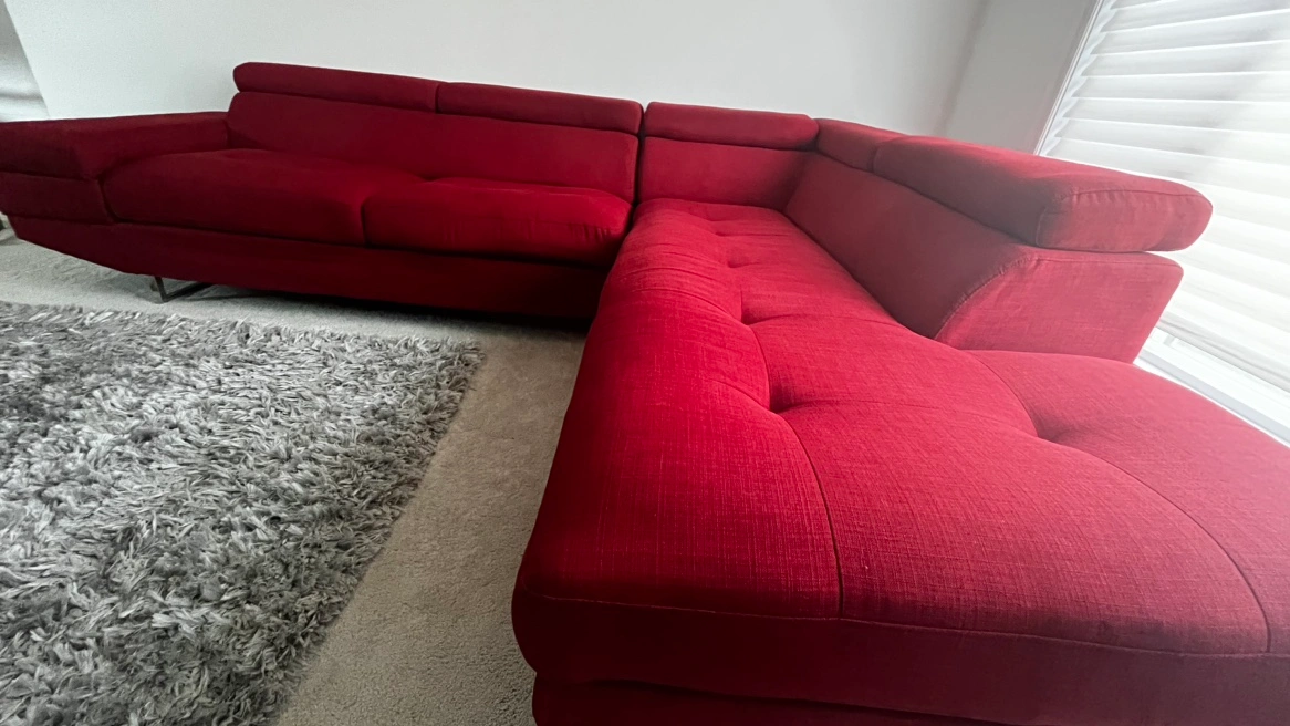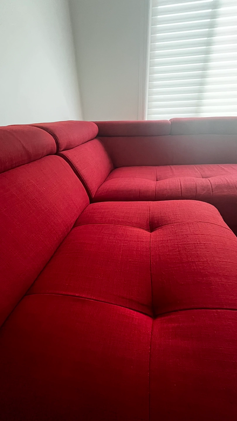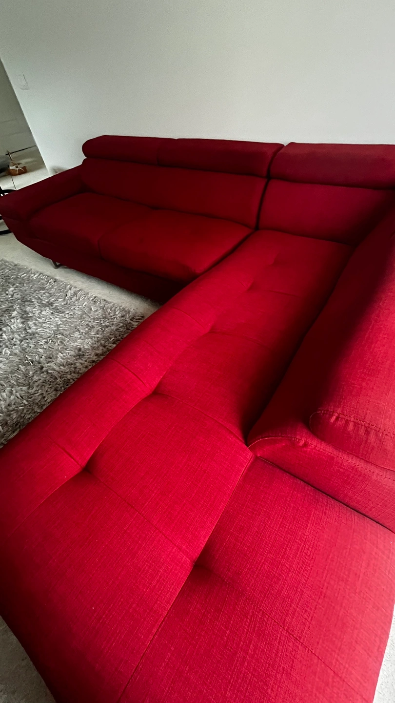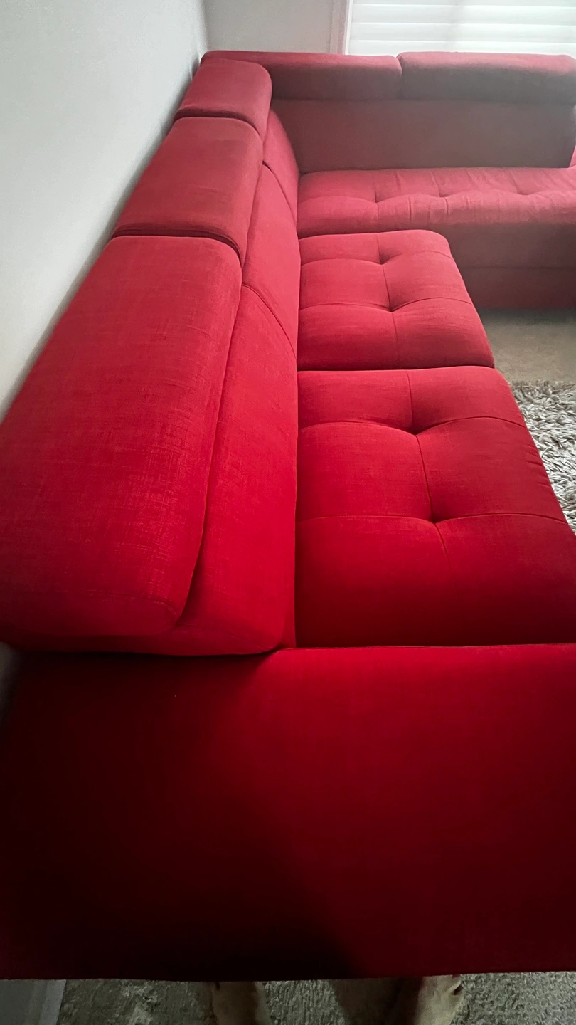 Large red sectional sofa with metal legs. Dimensions are noted in the photos. The sofa is in excellent condition and very comfortable. It is about 3 years old and has been taken very good care of. No smoke no Pet family. Originally paid over $1800 for it.