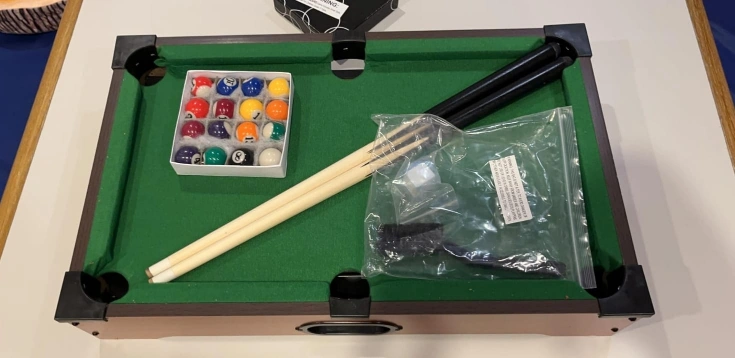 Small Billiards Game with 16 Resin Balls, 2 Pool Cues, Triangle Rack, & Chalk