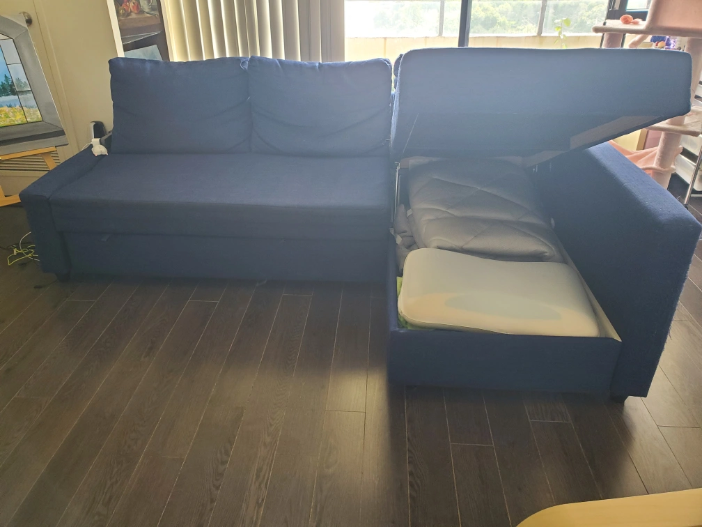 L shaped pull out couch that turns into a queen side bed. In good shape. Lots of storage.