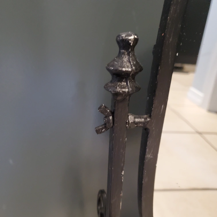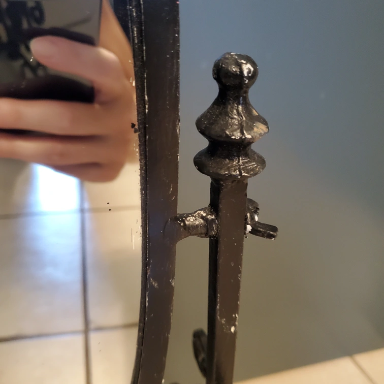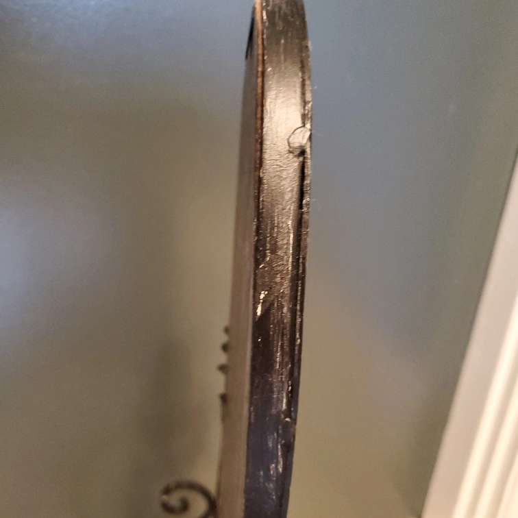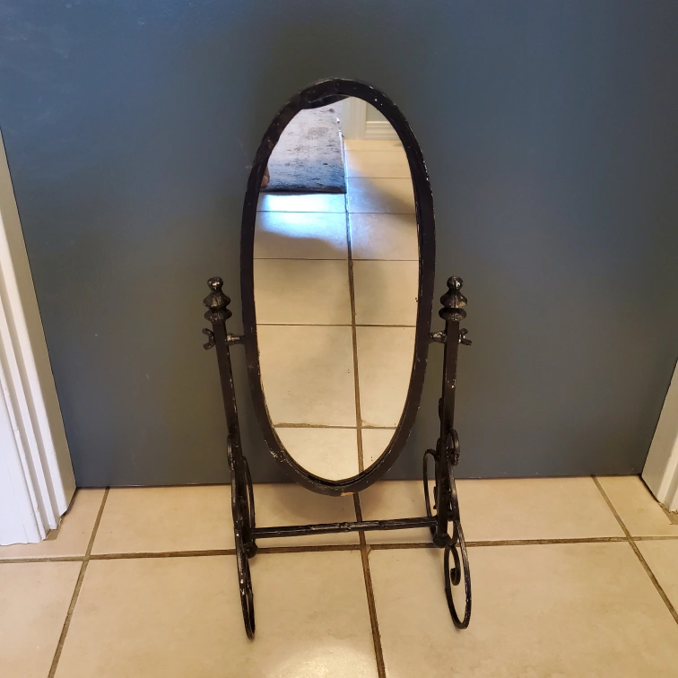 Black metal vanity mirror with an oval shape and decorative base. mirror stands 19.5" tall by 8" wide. One side curves in a bit.