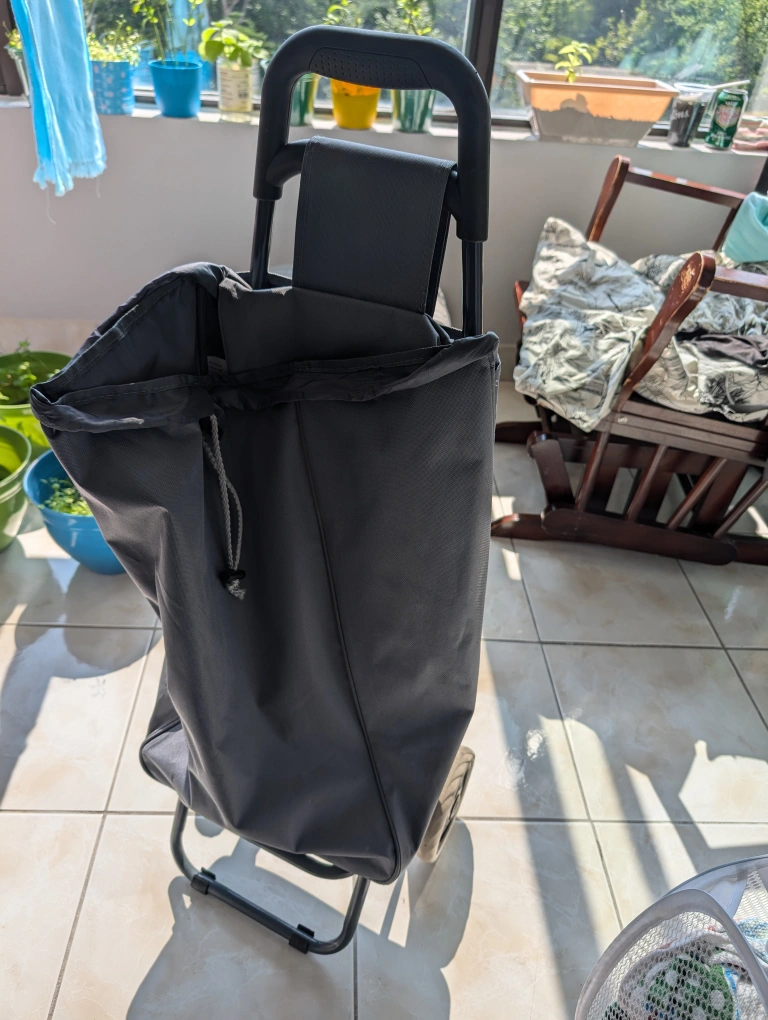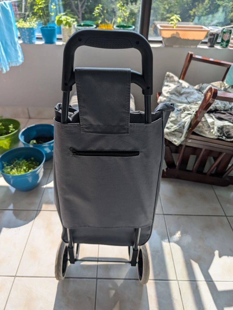 A folding shopping cart with a large capacity bag and a zippered pocket. It has a handle with a padded area for comfort. It has 2 wheels, It folds for easy storage.