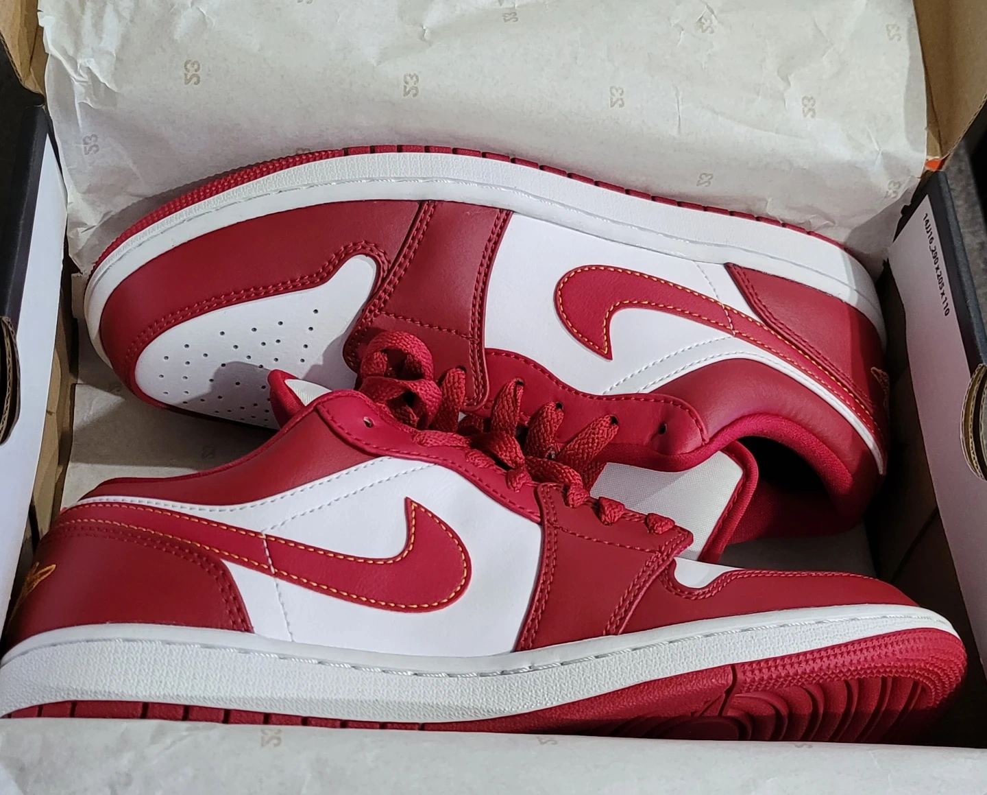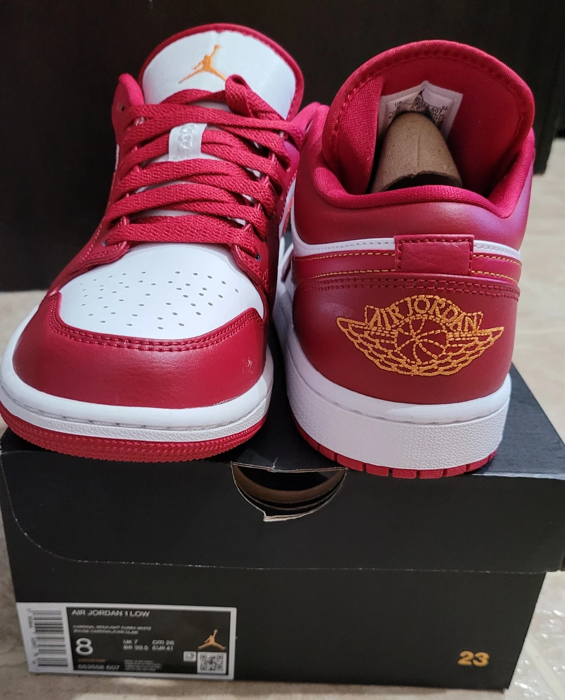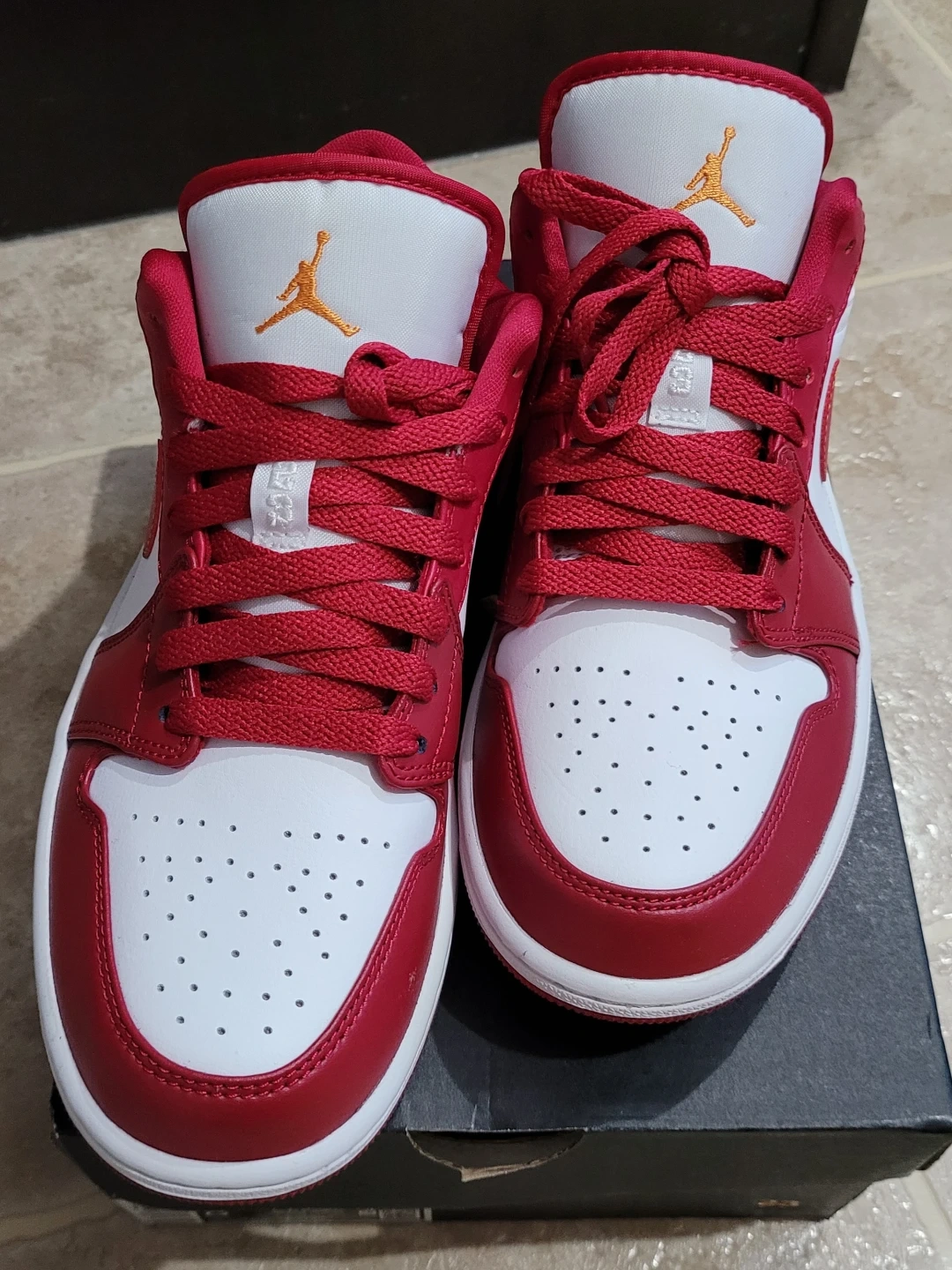 It's a pair of Air Jordan 1 Low sneakers in Cardinal Red, Light Curry, and White. Includes original box. Brand New