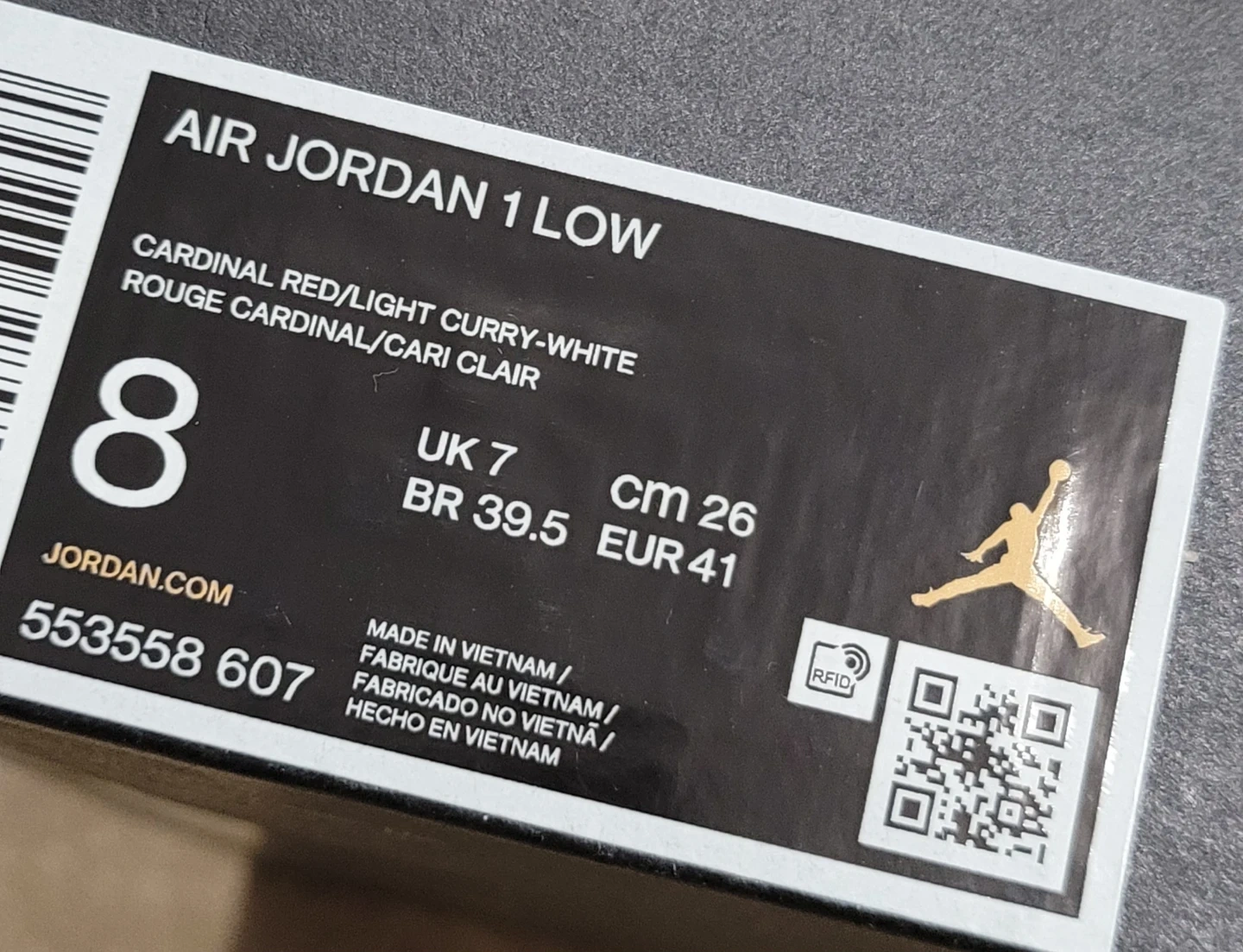 It's a pair of Air Jordan 1 Low sneakers in Cardinal Red, Light Curry, and White. Includes original box. Brand New