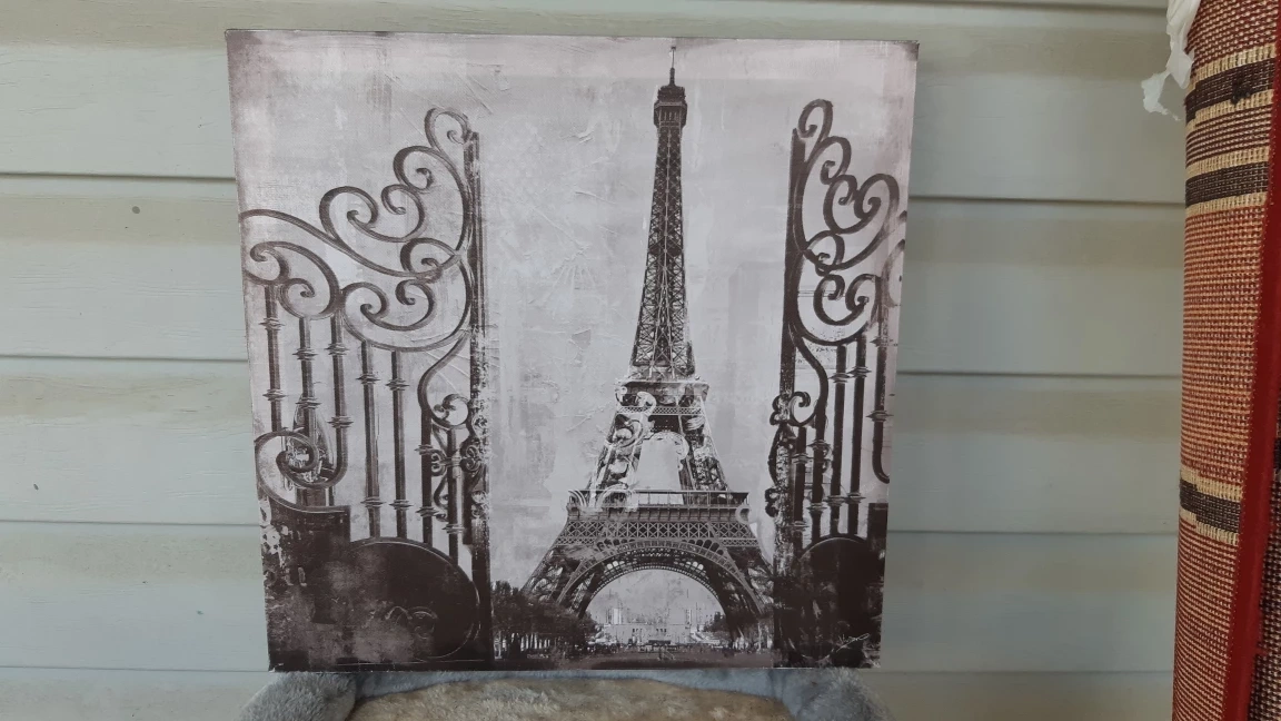 A canvas with an Eiffel Tower print. The tower is framed by two black gate-like designs. The background is a textured grey.