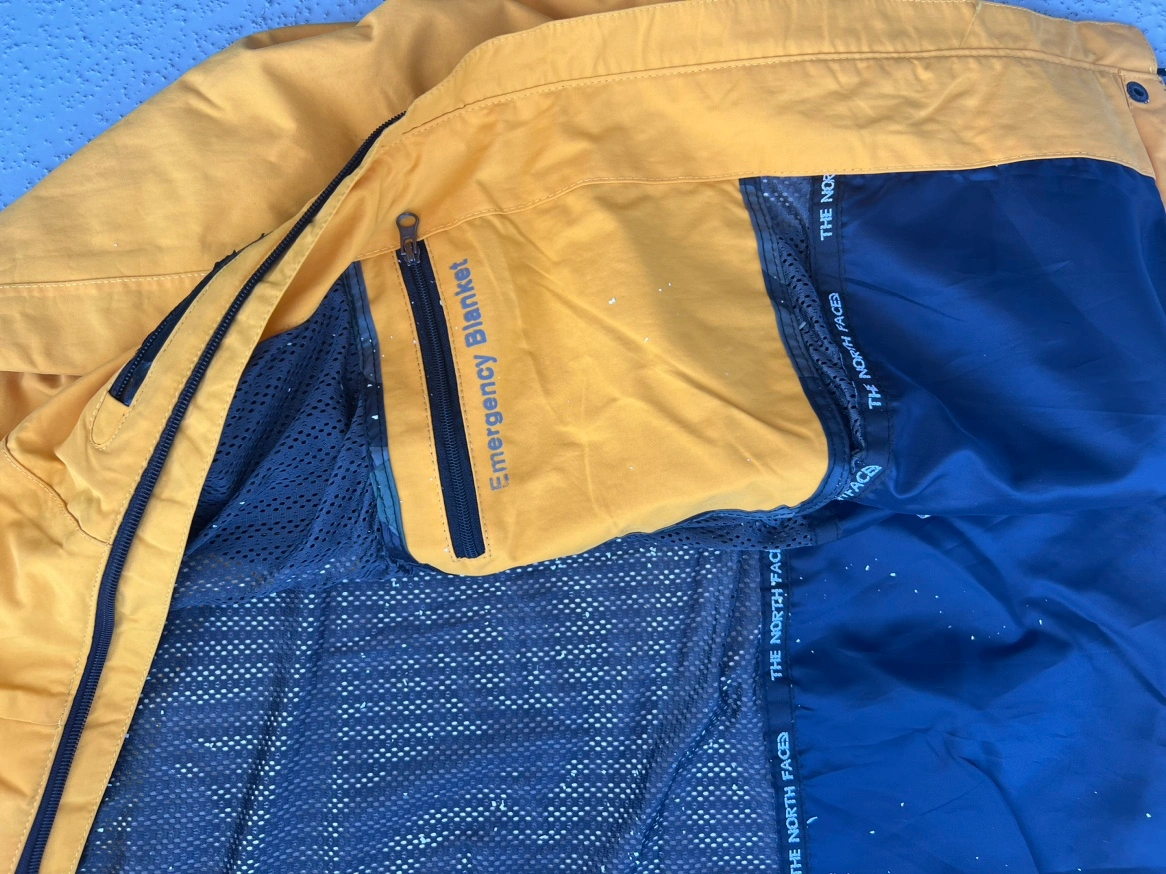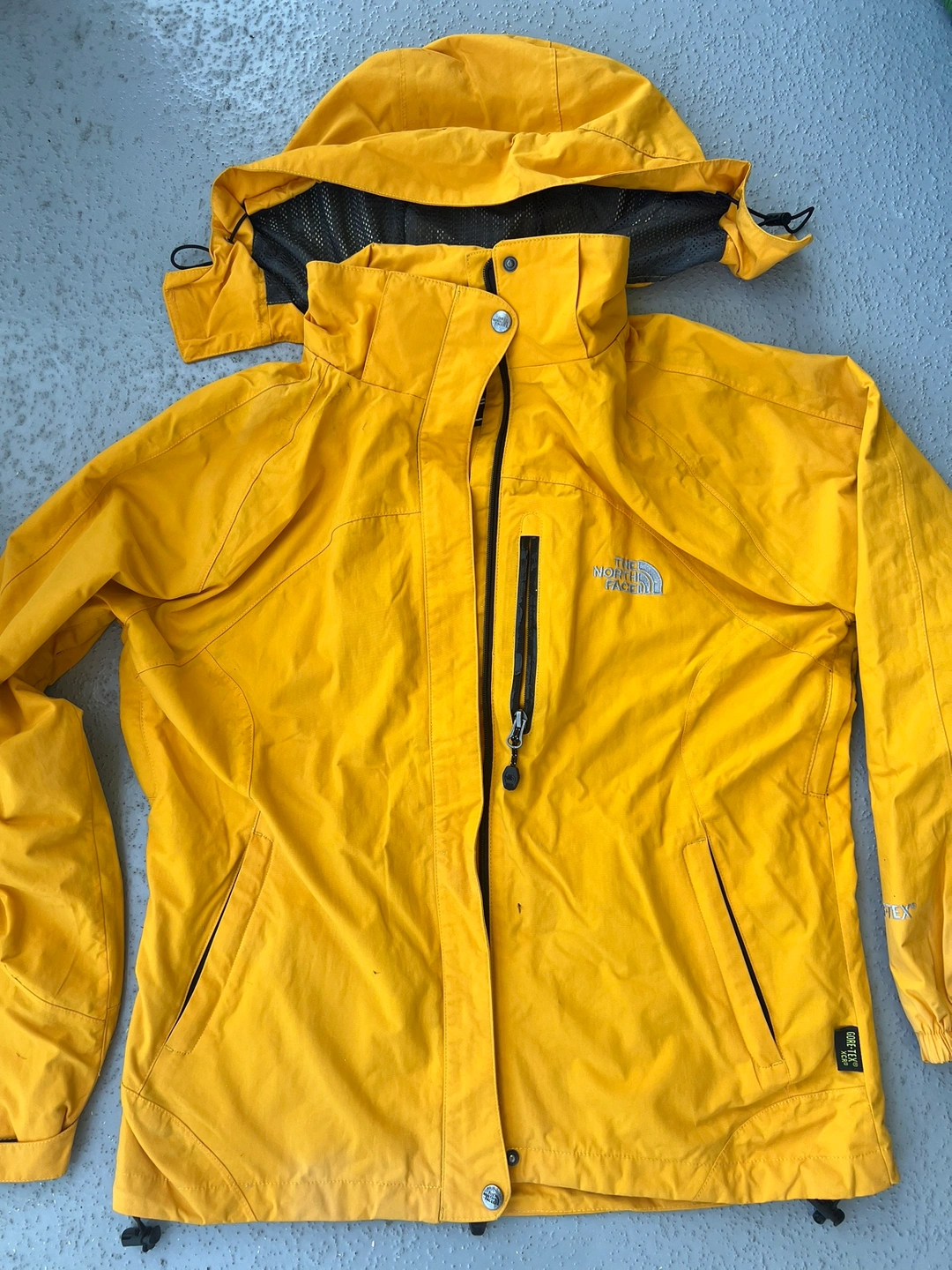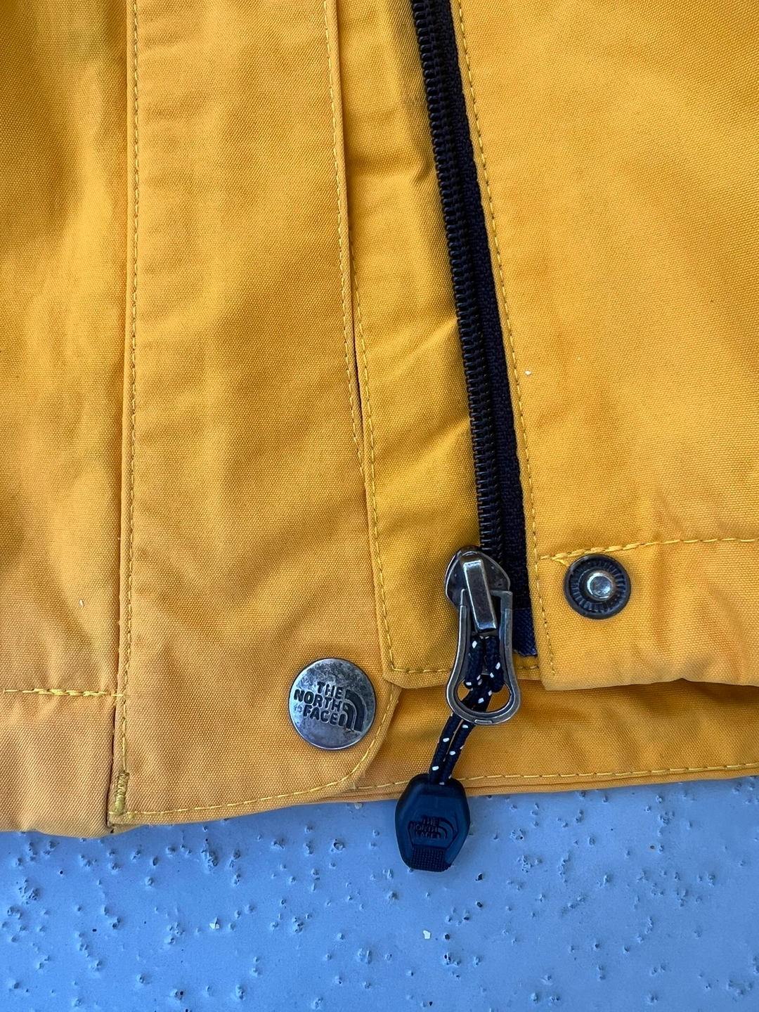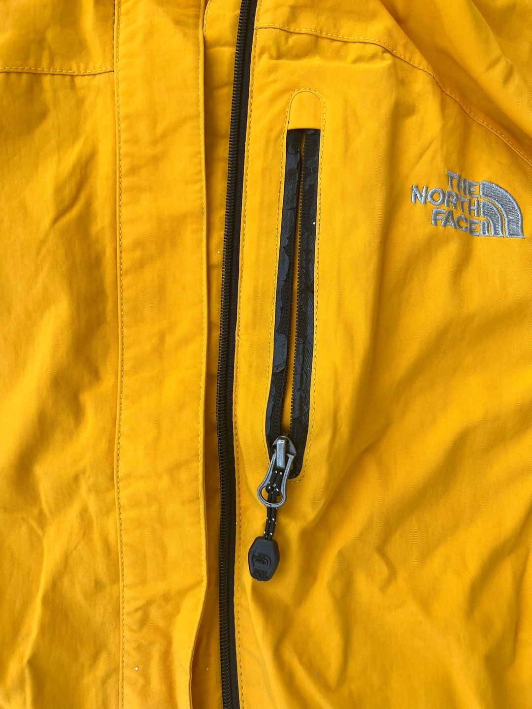 A yellow The North Face jacket with a hood. The jacket is made of Gore-Tex. The jacket has a zipper closure and a drawstring at the waist. It also has several pockets.