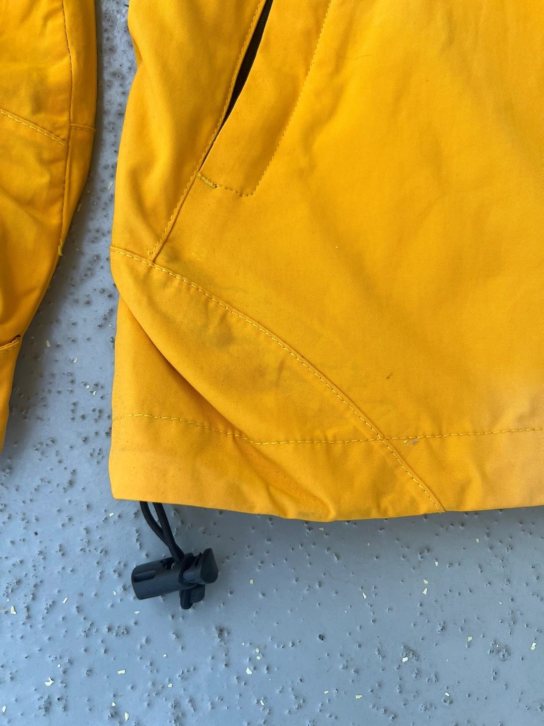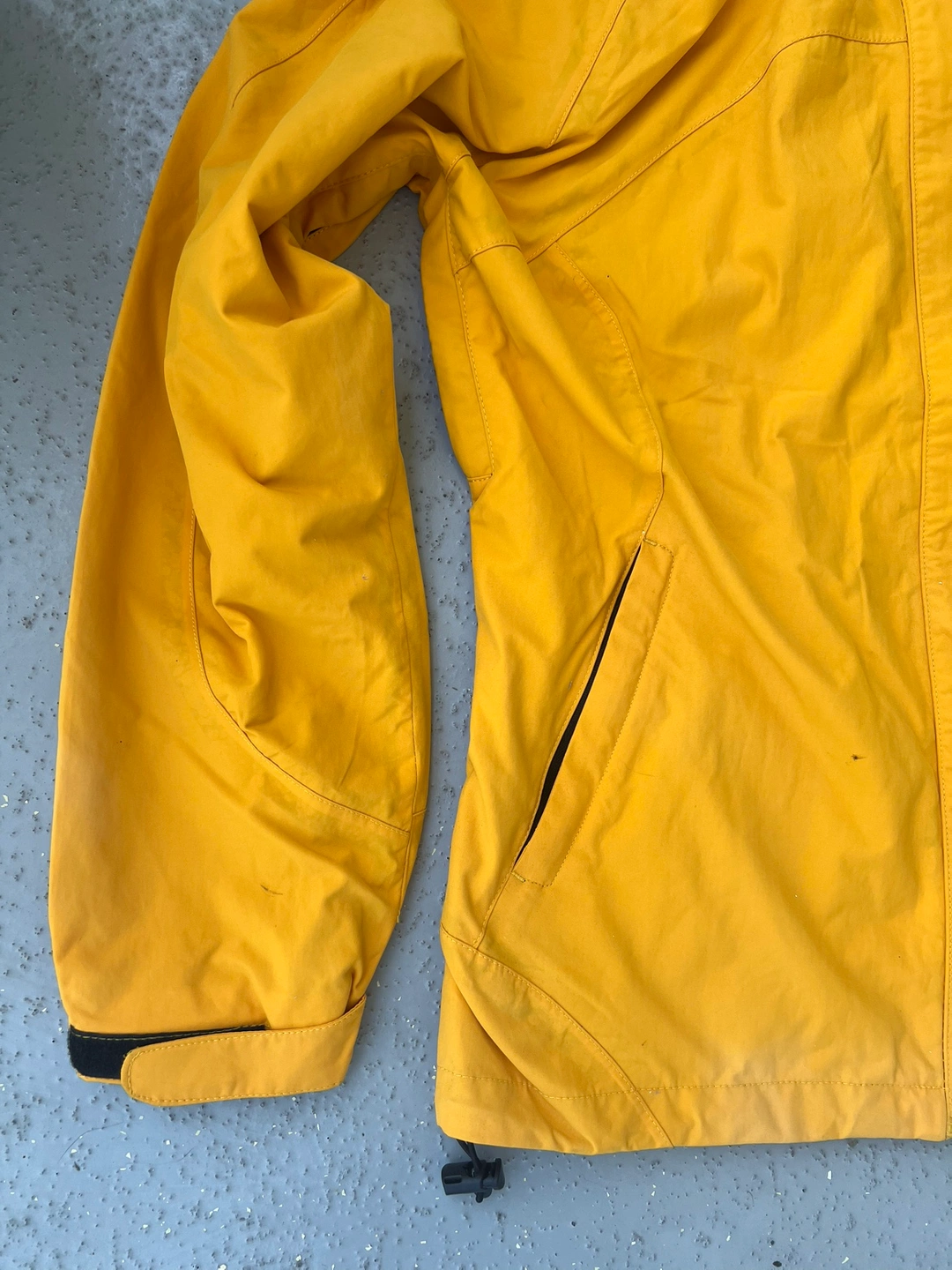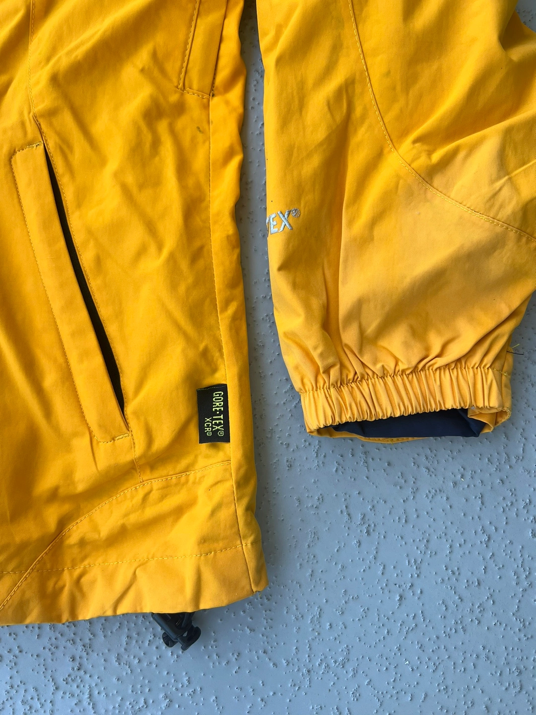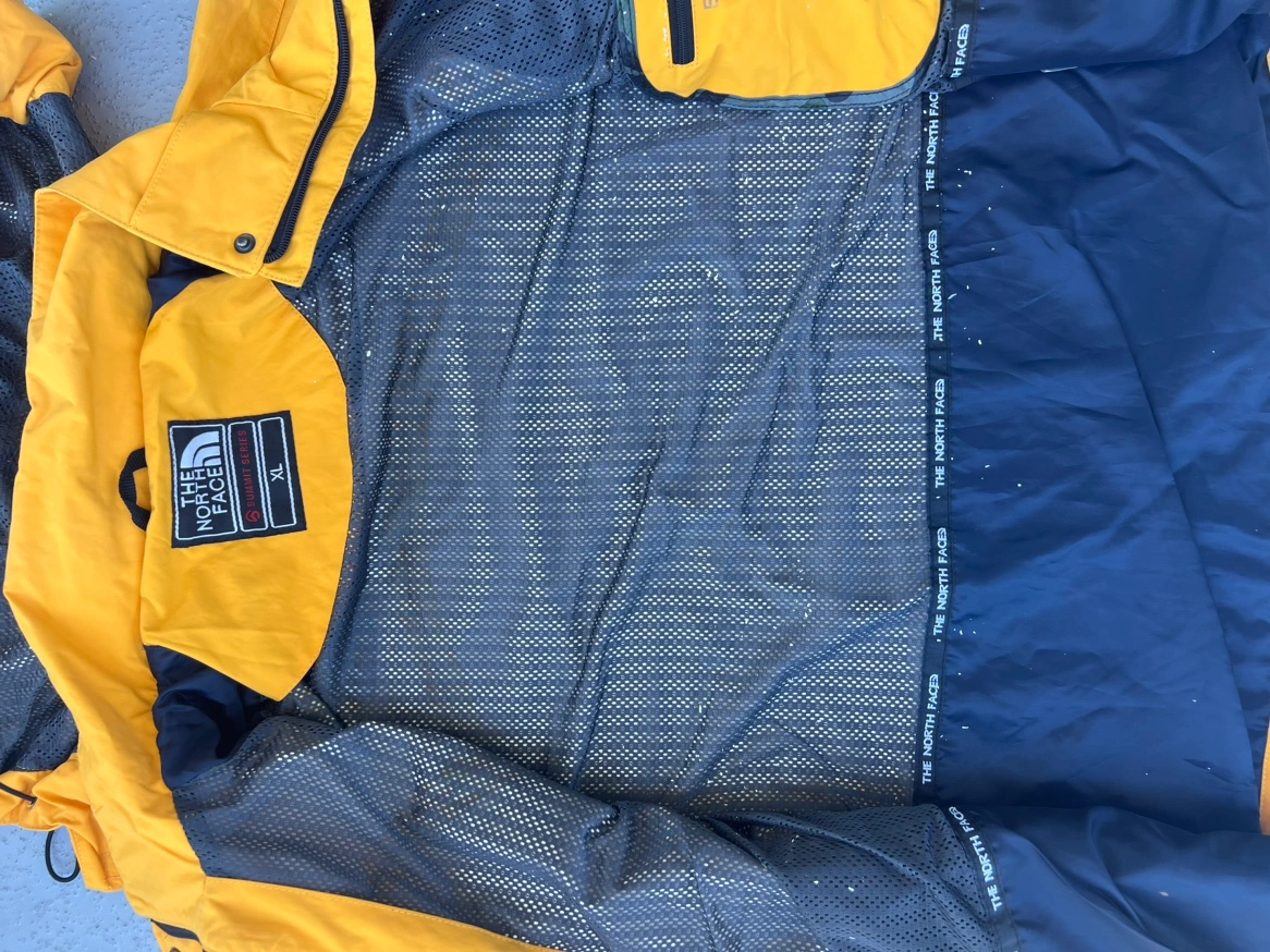 A yellow The North Face jacket with a hood. The jacket is made of Gore-Tex. The jacket has a zipper closure and a drawstring at the waist. It also has several pockets.