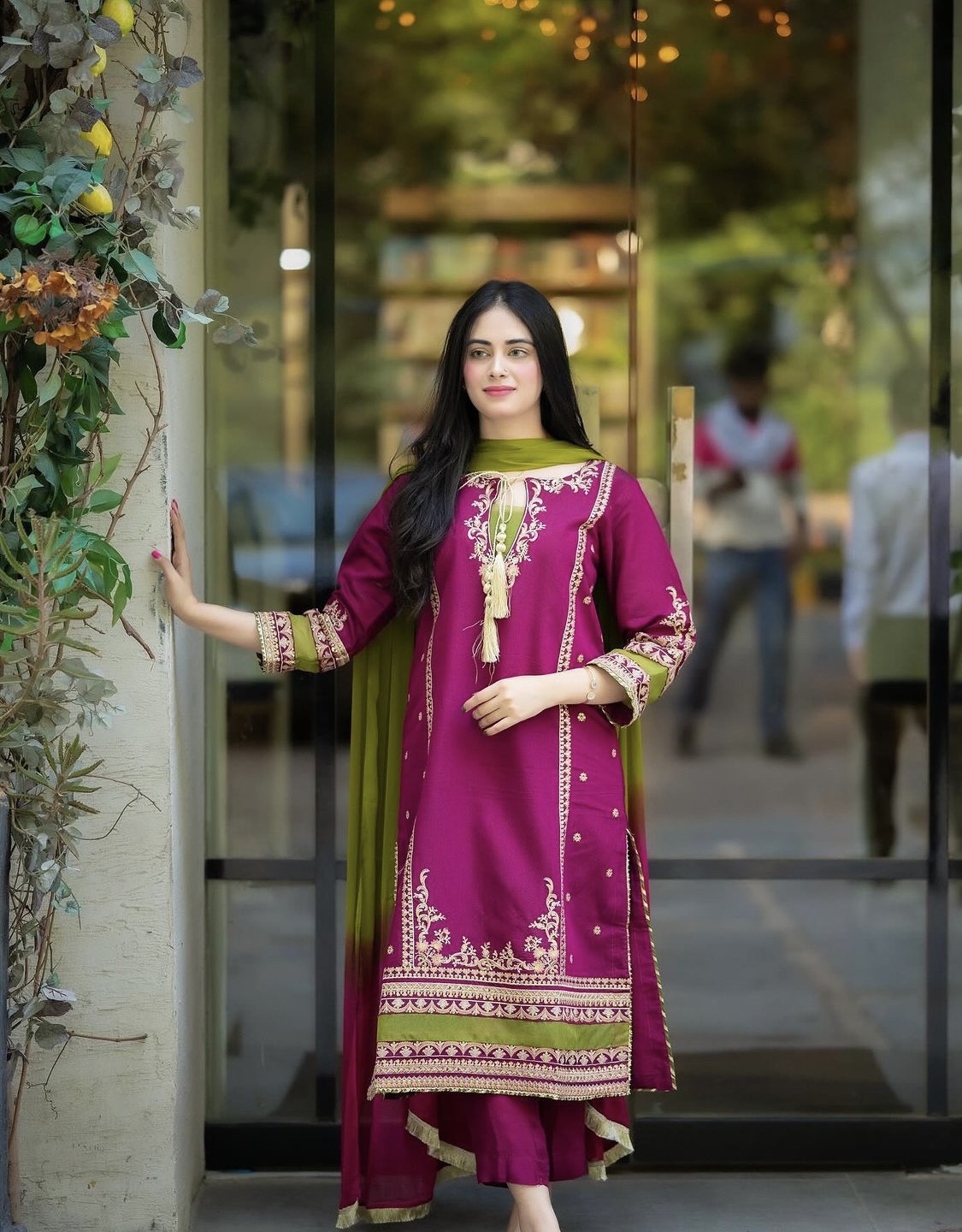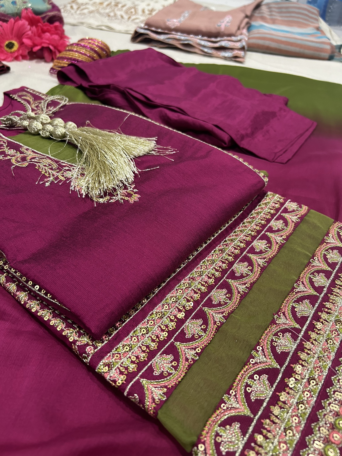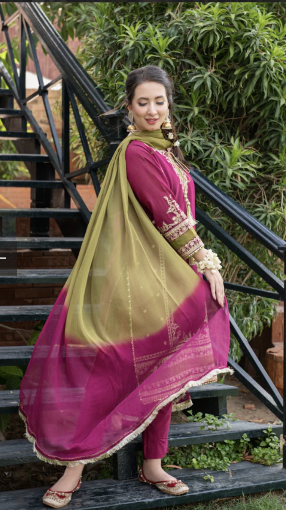 111This suit is a beautiful three-piece suit that includes a long-sleeved shirt, pants, and a dupatta. The shirt is a stunning shade of pink and features intricate embroidery in gold thread. The pants are a simple pink colour. The dupatta is a light green colour and is made of chiffon. It features a ombre effect with the bottom of the dupatta being a darker green and the top being a lighter green. The dupatta also features a beautiful fringe along the edges. The suit is perfect for any special occasion.