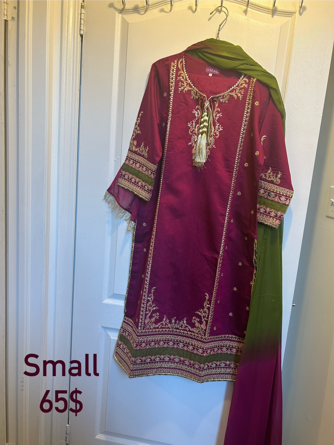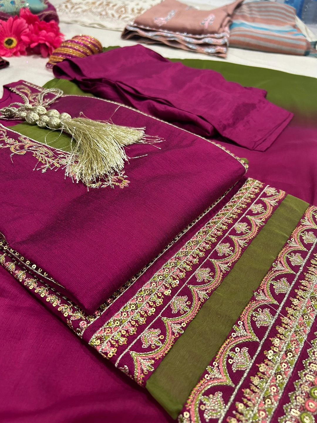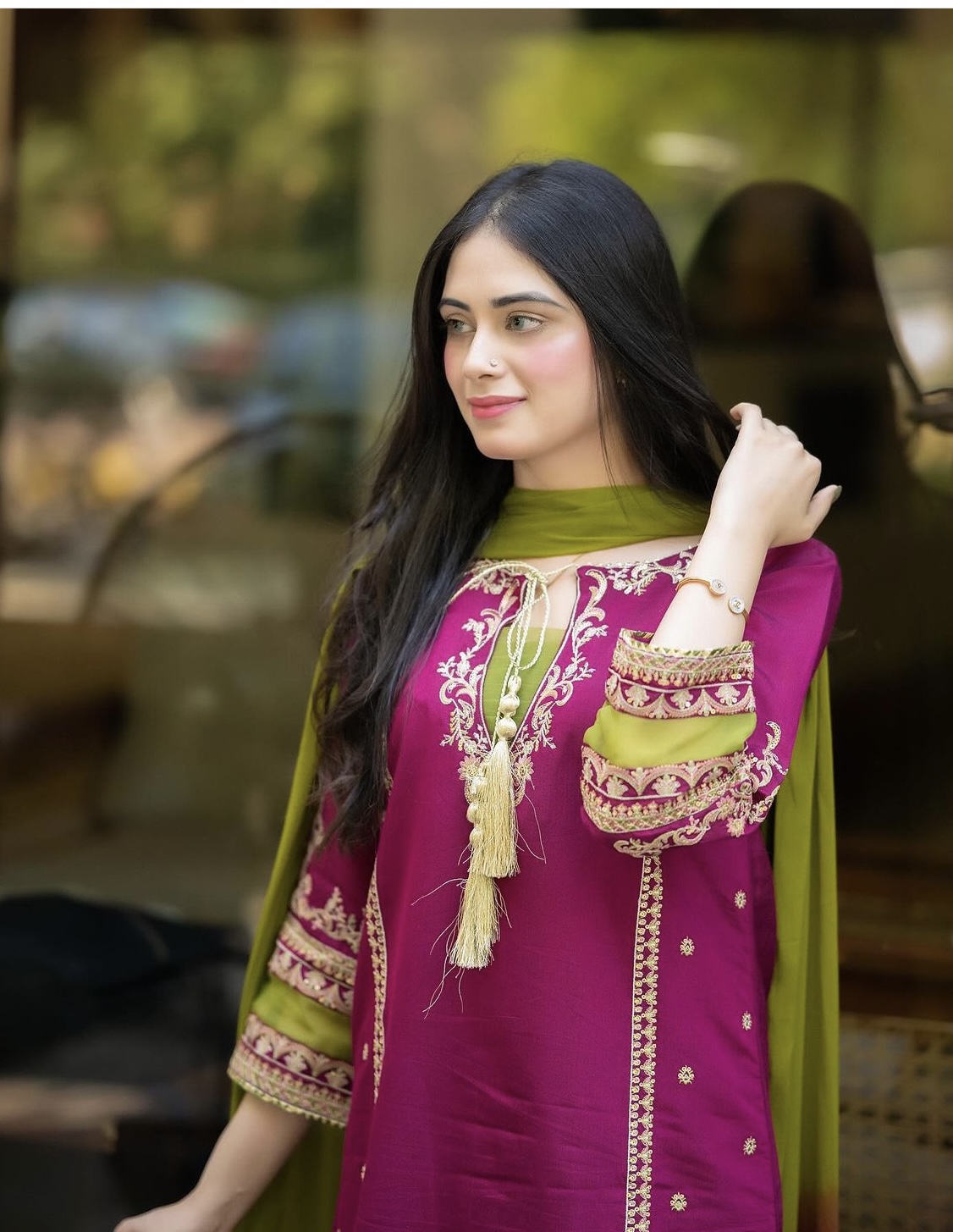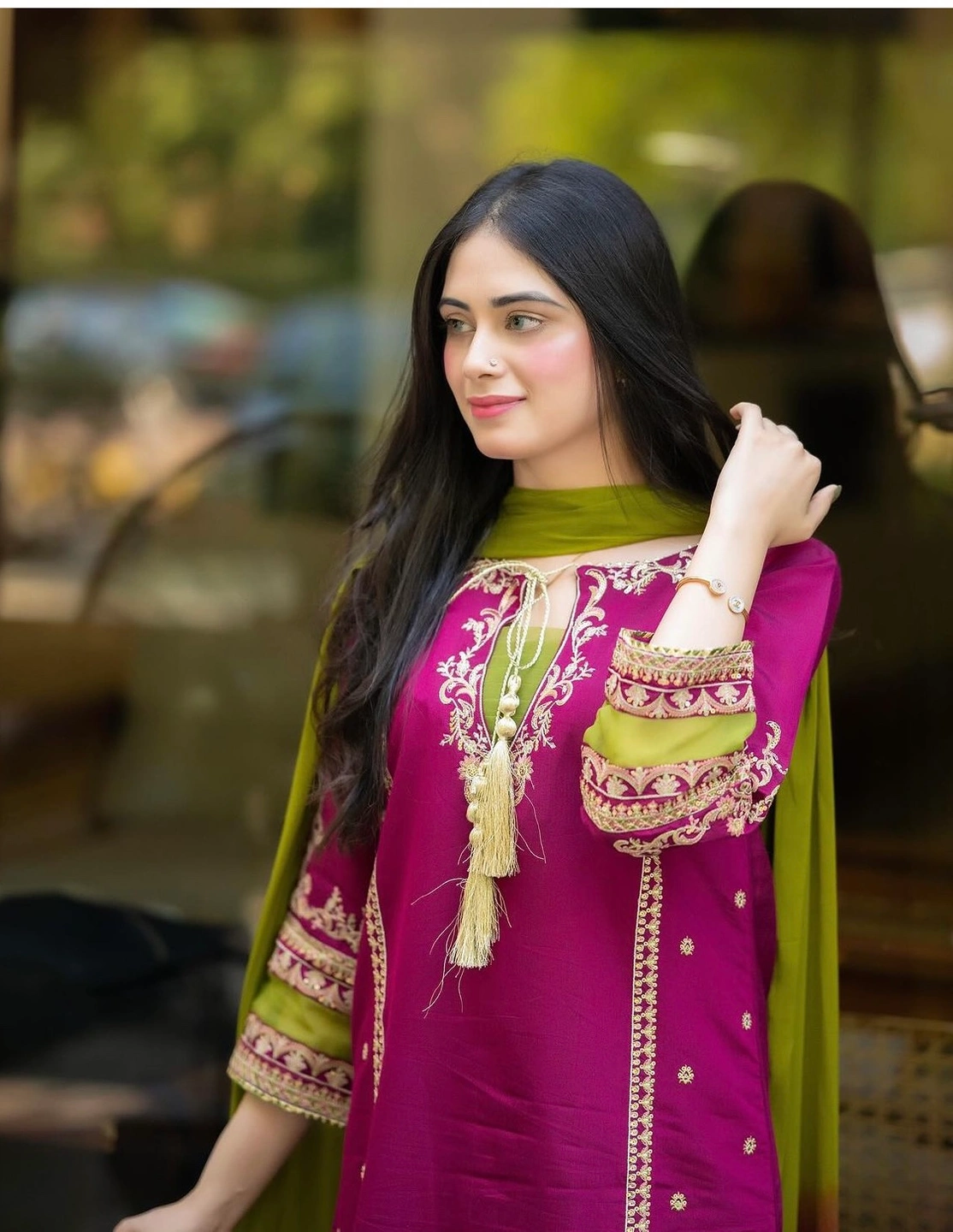 111This suit is a beautiful three-piece suit that includes a long-sleeved shirt, pants, and a dupatta. The shirt is a stunning shade of pink and features intricate embroidery in gold thread. The pants are a simple pink colour. The dupatta is a light green colour and is made of chiffon. It features a ombre effect with the bottom of the dupatta being a darker green and the top being a lighter green. The dupatta also features a beautiful fringe along the edges. The suit is perfect for any special occasion.