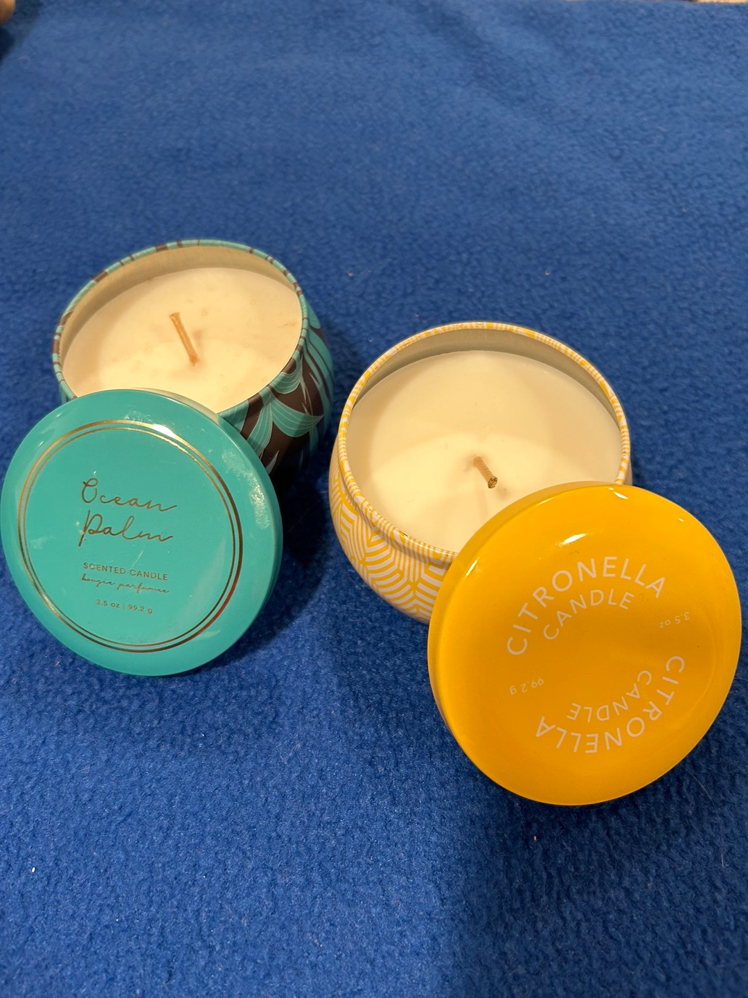 1000+Two scented candles in decorative tins. One is Ocean Palm, the other is Citronella. Both are 3.5oz. Leftover from summer gatherings. Target brand New candles