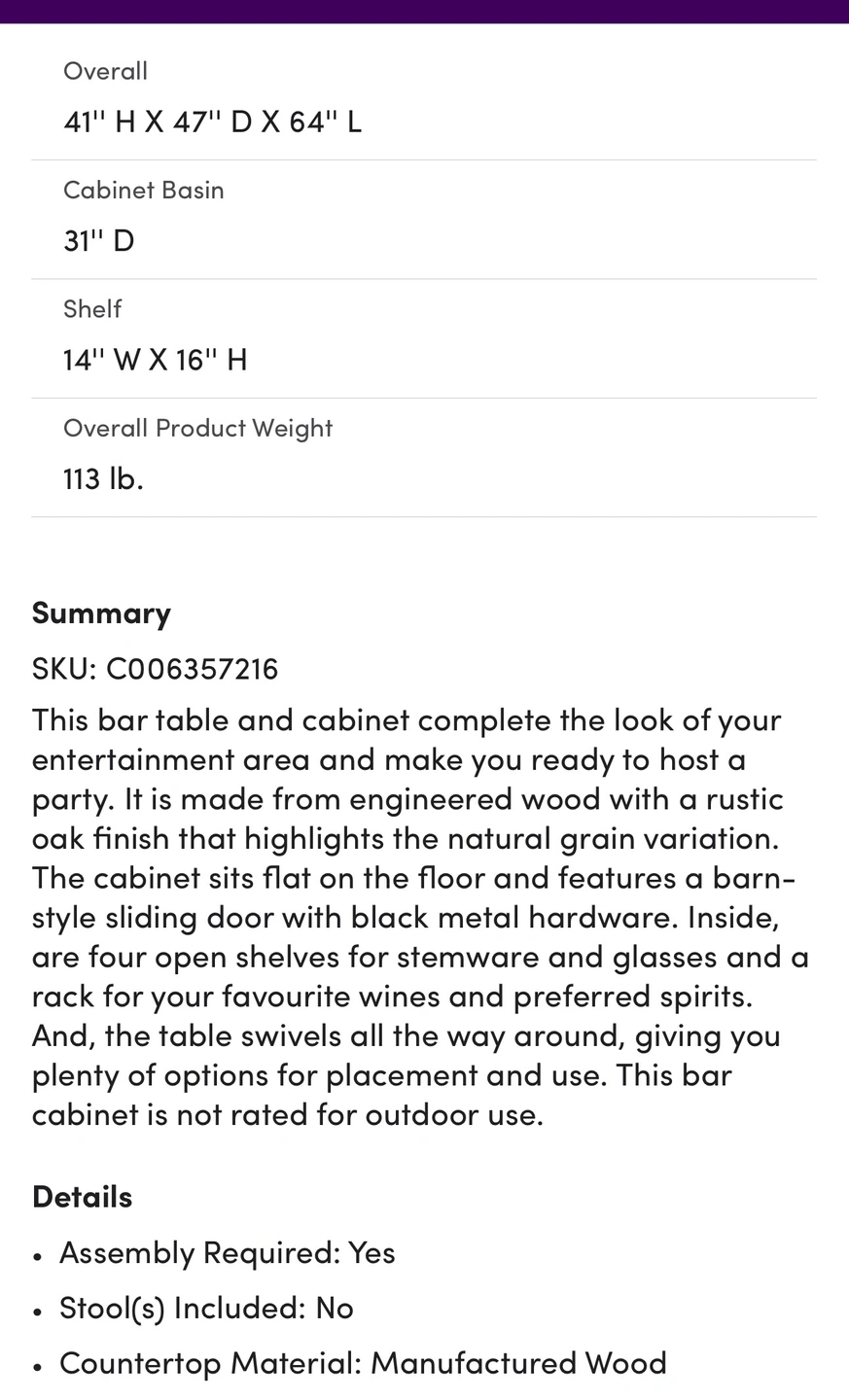 This bar cart has a sliding door, a wine rack and a shelf. It can be used as a bar, a serving table or a small desk. It has a rustic style and is brand new still in box not assembled. The second last pic that is assembled is the one i am using. Got identical one as gift . Let me know if you prefer you prefer assembled ones or have the new one assembled (additional charges apply)