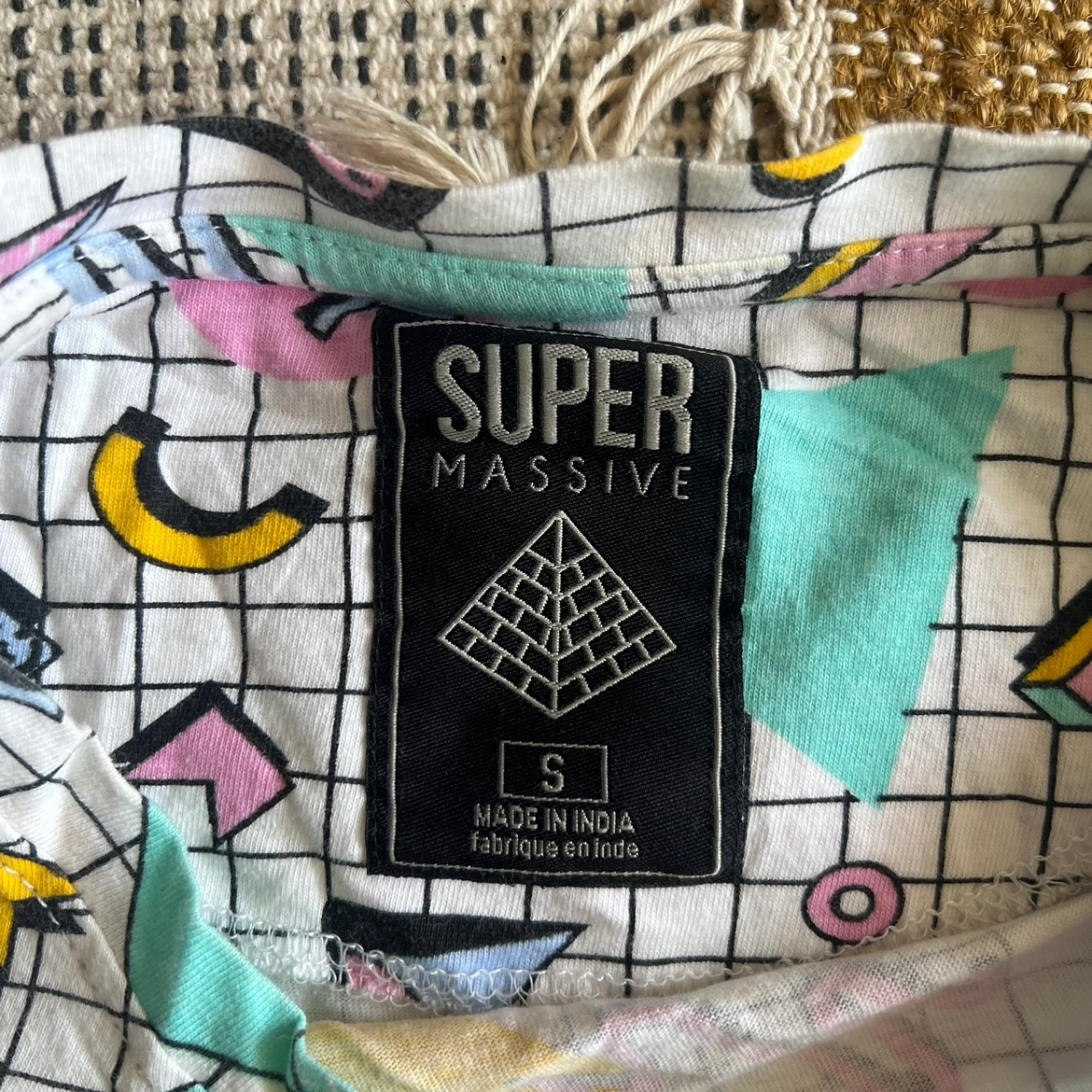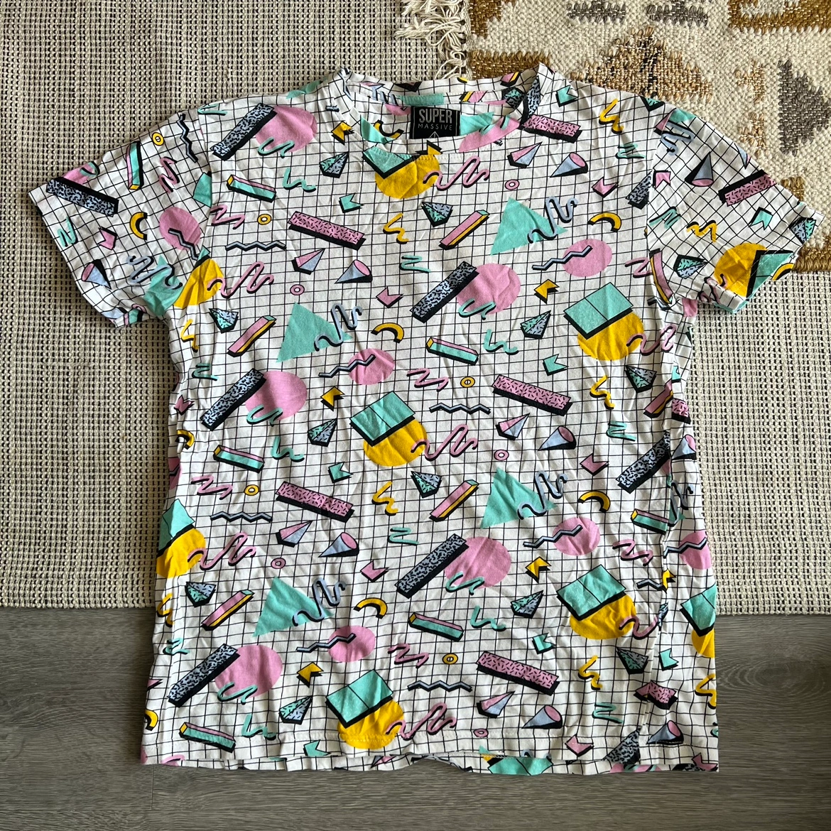 white t-shirt with a geometric pattern in pink, yellow, blue, and green.