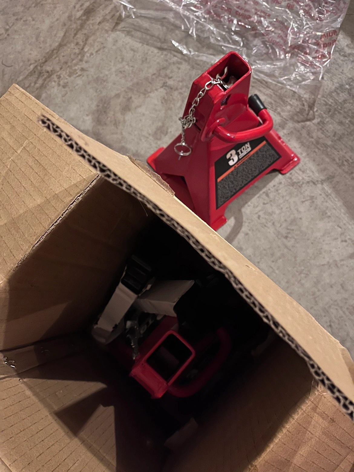 A set of two 3 ton jack stands with double lock. The stands are red with a black rubber base. They include a chain and a hook. They are in their original box.