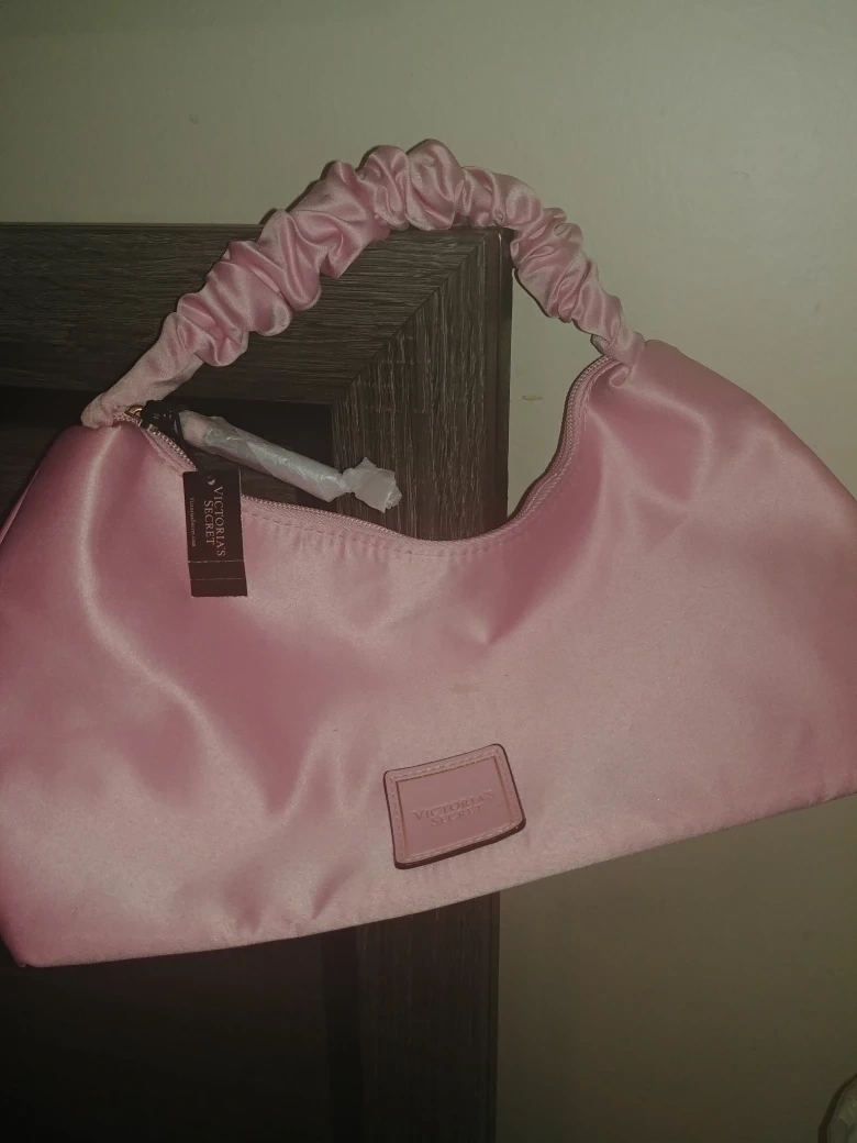 This is a small pink handbag with a ruffled strap and a zipper closure. It has the Victoria's Secret logo on the front. Brand New. price is firm. pick up Midland and Danforth or young bloor or 401 bay street