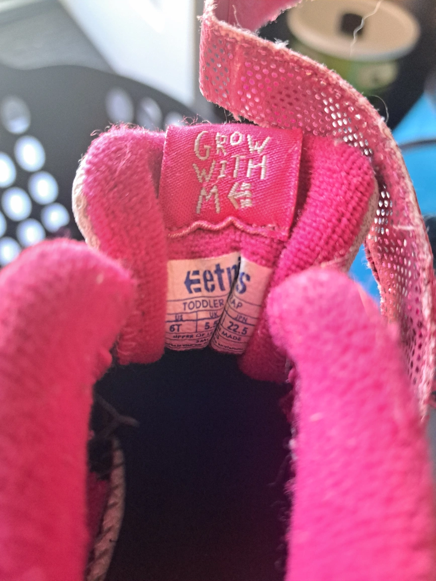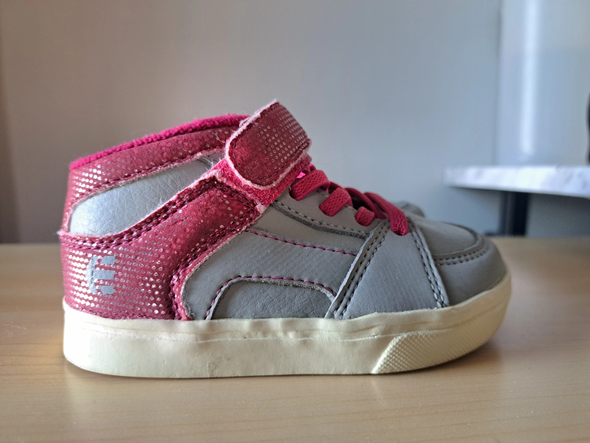 Grey and pink sneakers with adjustable straps and velcro closure.