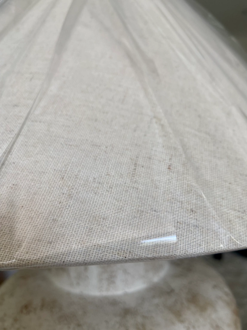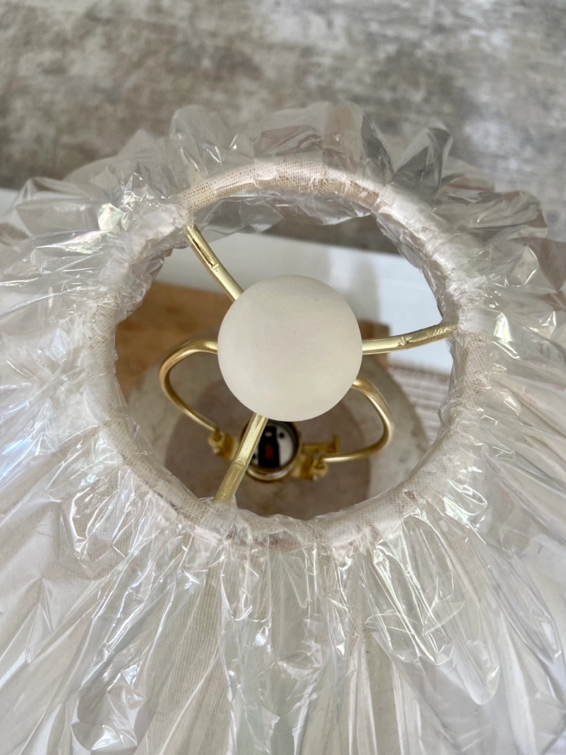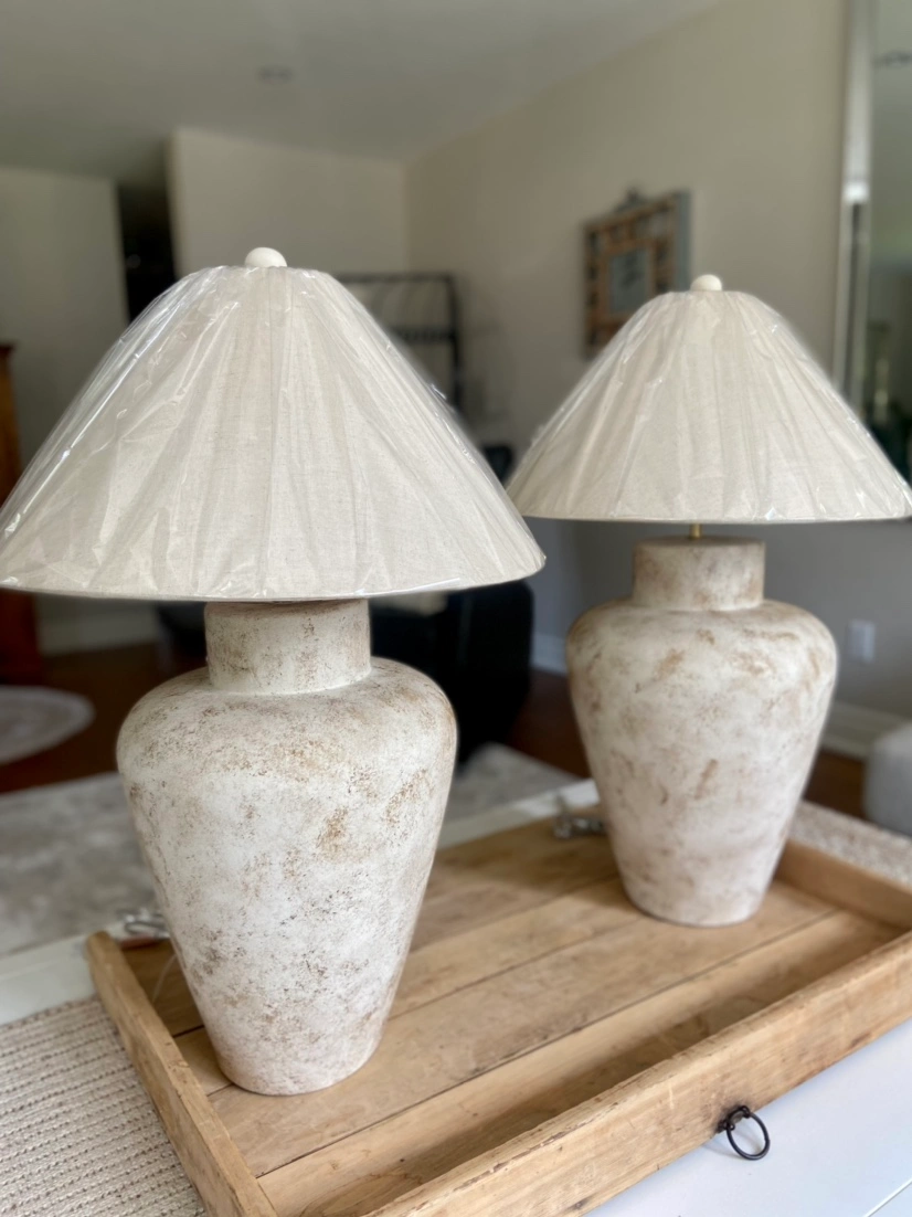 Brand-new, covers still on lampshades. Shades are an oatmeal colour. One lamp is slightly taller than the other if you look closely. Both are approximately 30" tall and 11" wide.