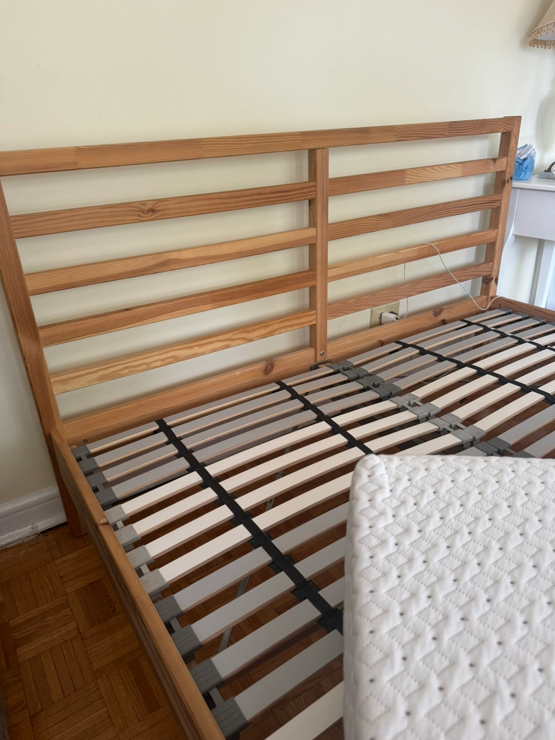 Queen bed and mattress moving sale $50 both .Note: the top of the bed broke and I put two screws in sides so it can hold it might need to screw it again . Anything else is fine i am moving and will have a bed in my new place .
