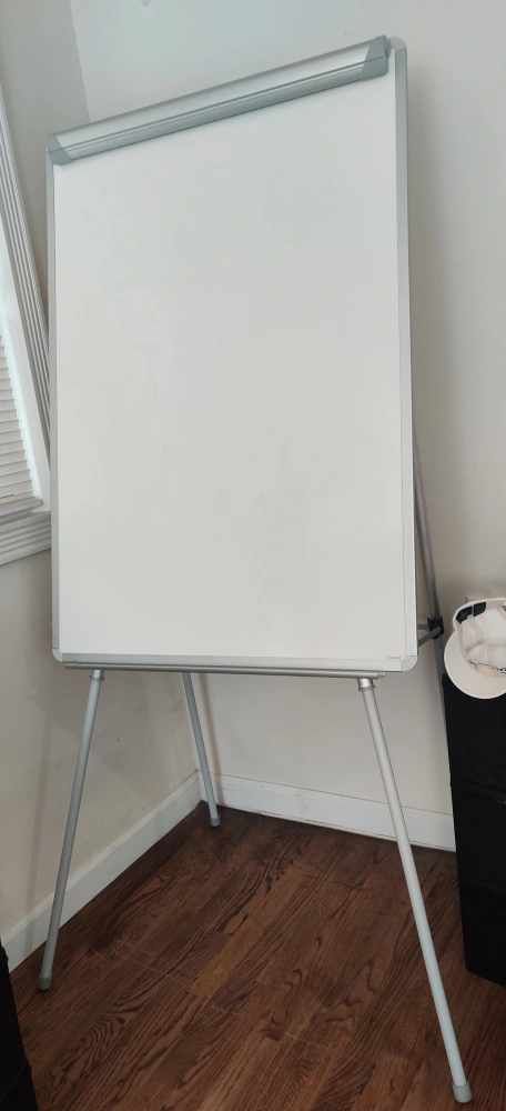 A whiteboard with a stand. The board is attached to the stand and can be flipped to reveal a new clean surface. The stand folds up for easy storage. never used brand new.