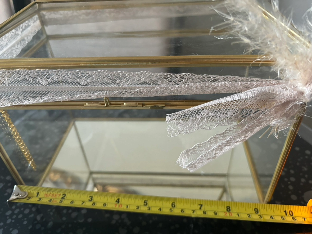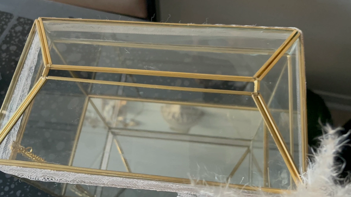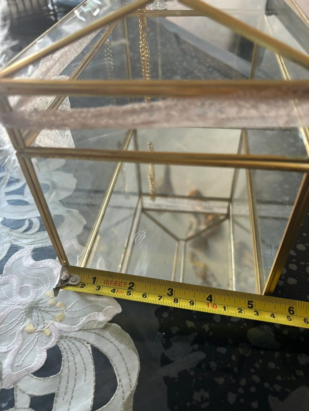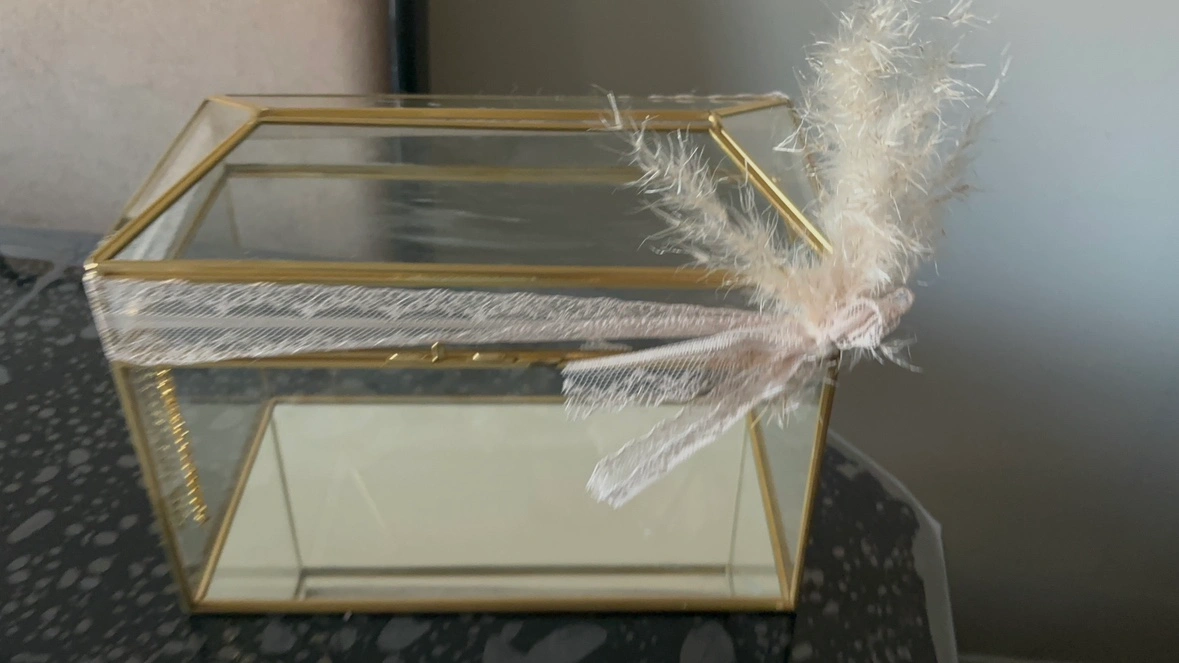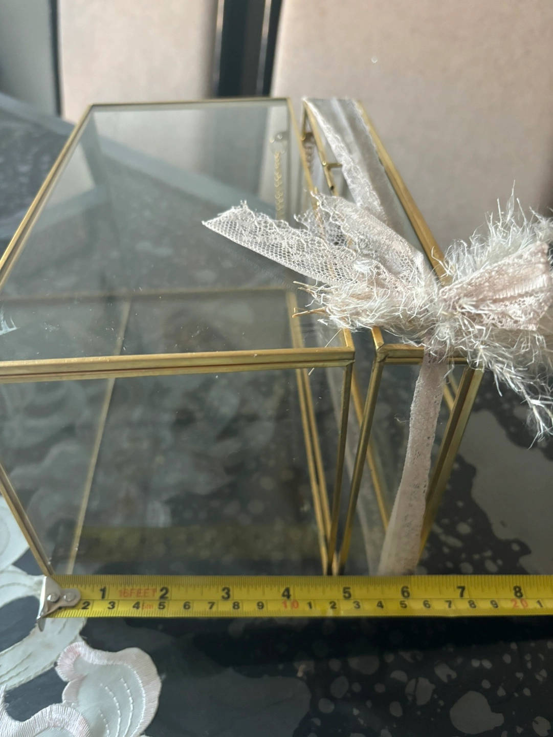 Glass display box with a gold trim and chain closure. The interior is mirrored. It comes with a ribbon and pampas embellishment on the lid.