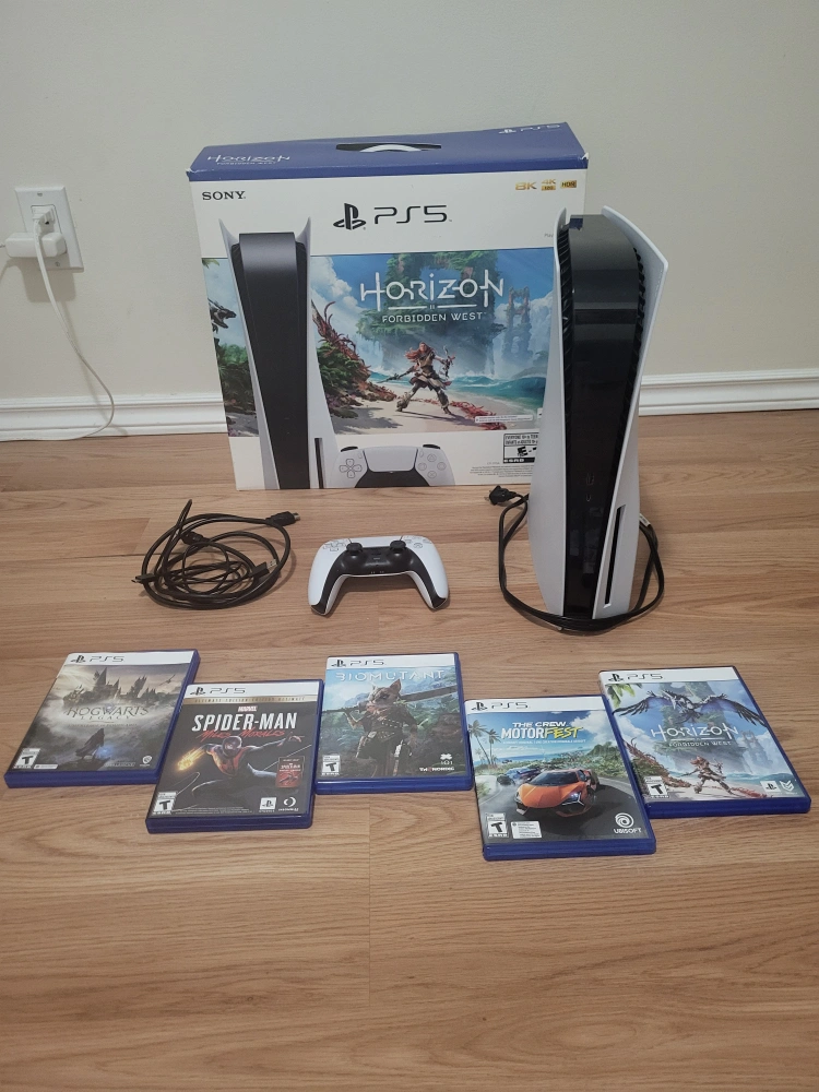 PlayStation 5 console with original box. Comes with 5 games: Horizon Forbidden West, Hogwarts Legacy, Spider-Man: Miles Morales, Biomutant, and The Crew: Motorfest. Includes a controller and all cables.