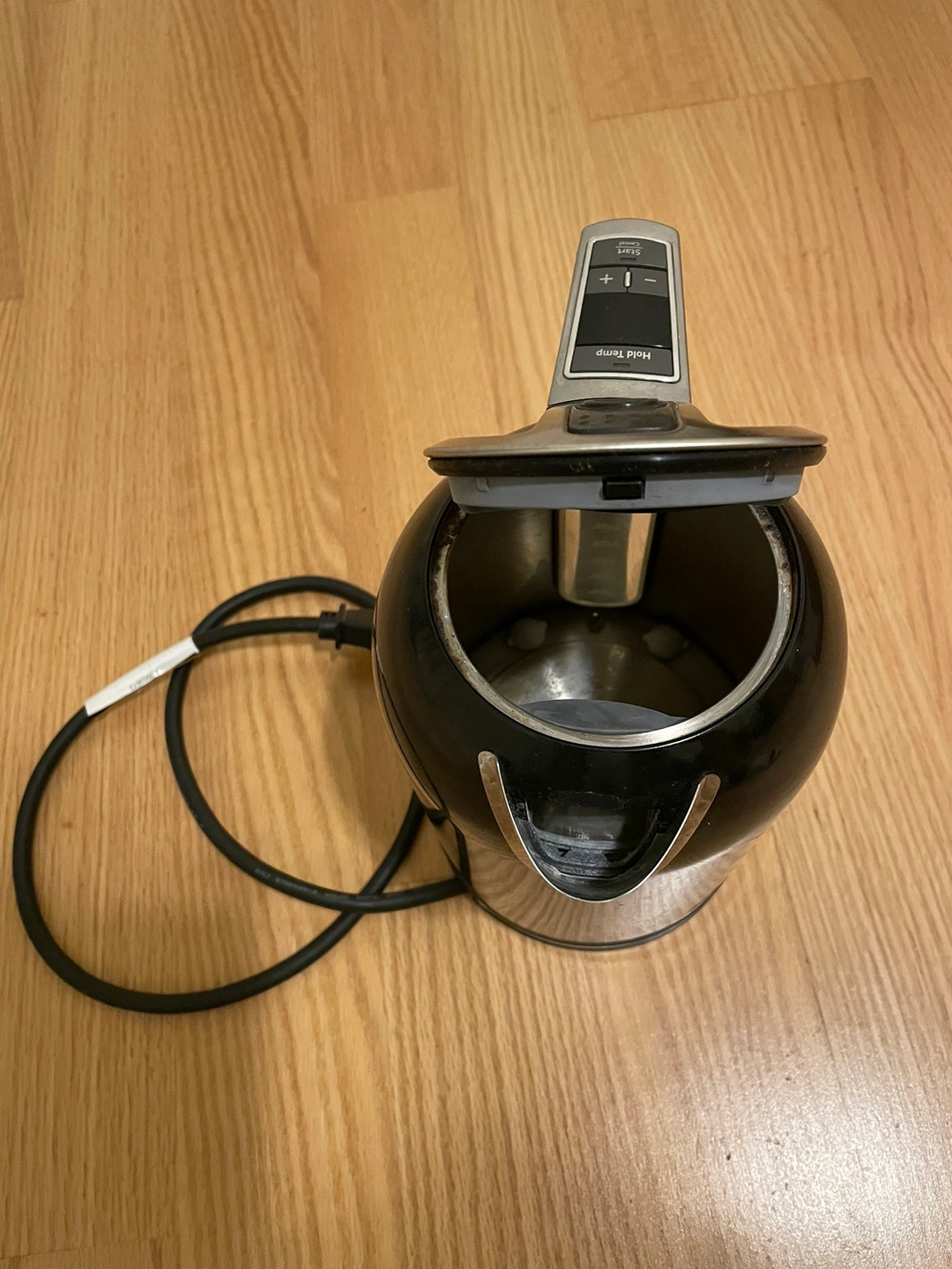 Black electric kettle with stainless steel accents. Features a keep-warm function. Includes a power cord. Giving it away as I no longer need it.