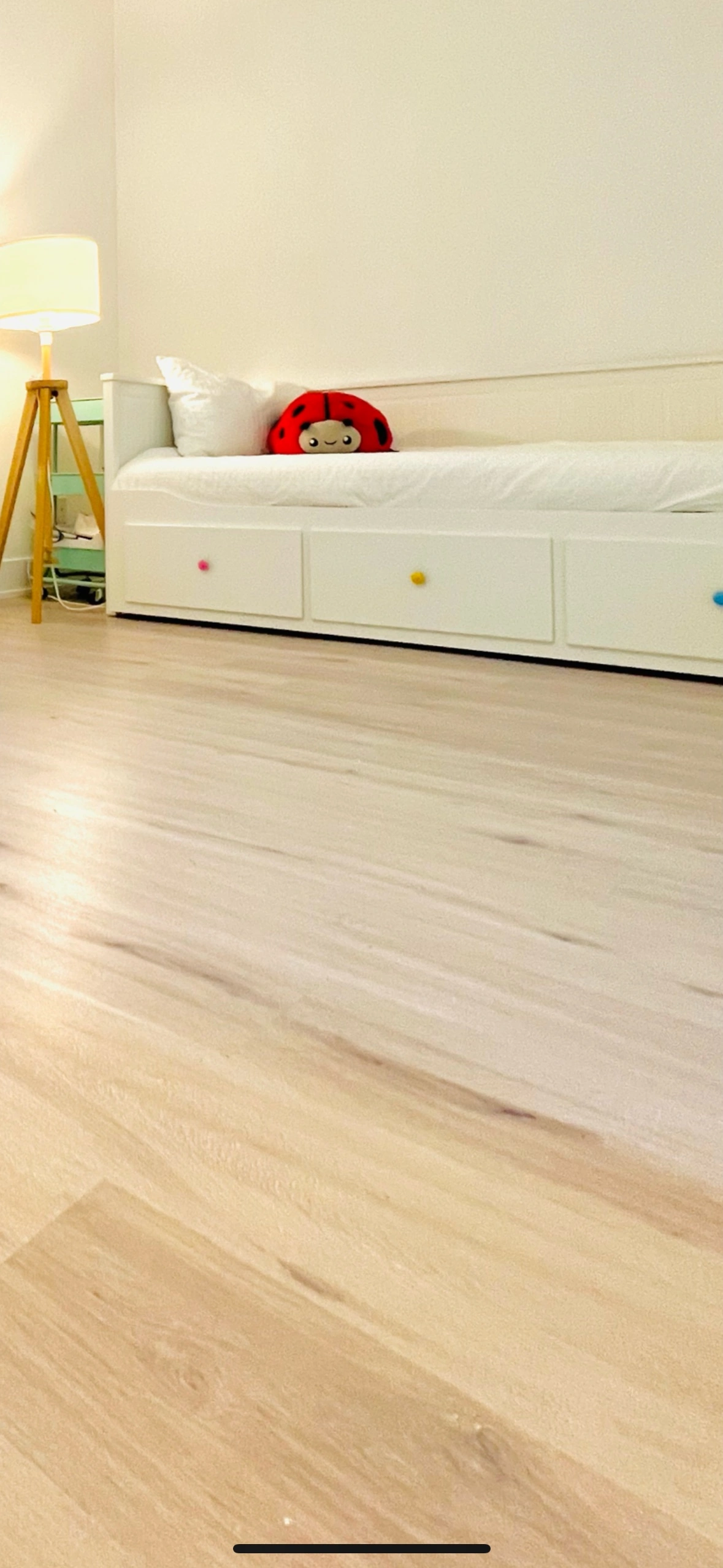 1-White daybed with three drawers.