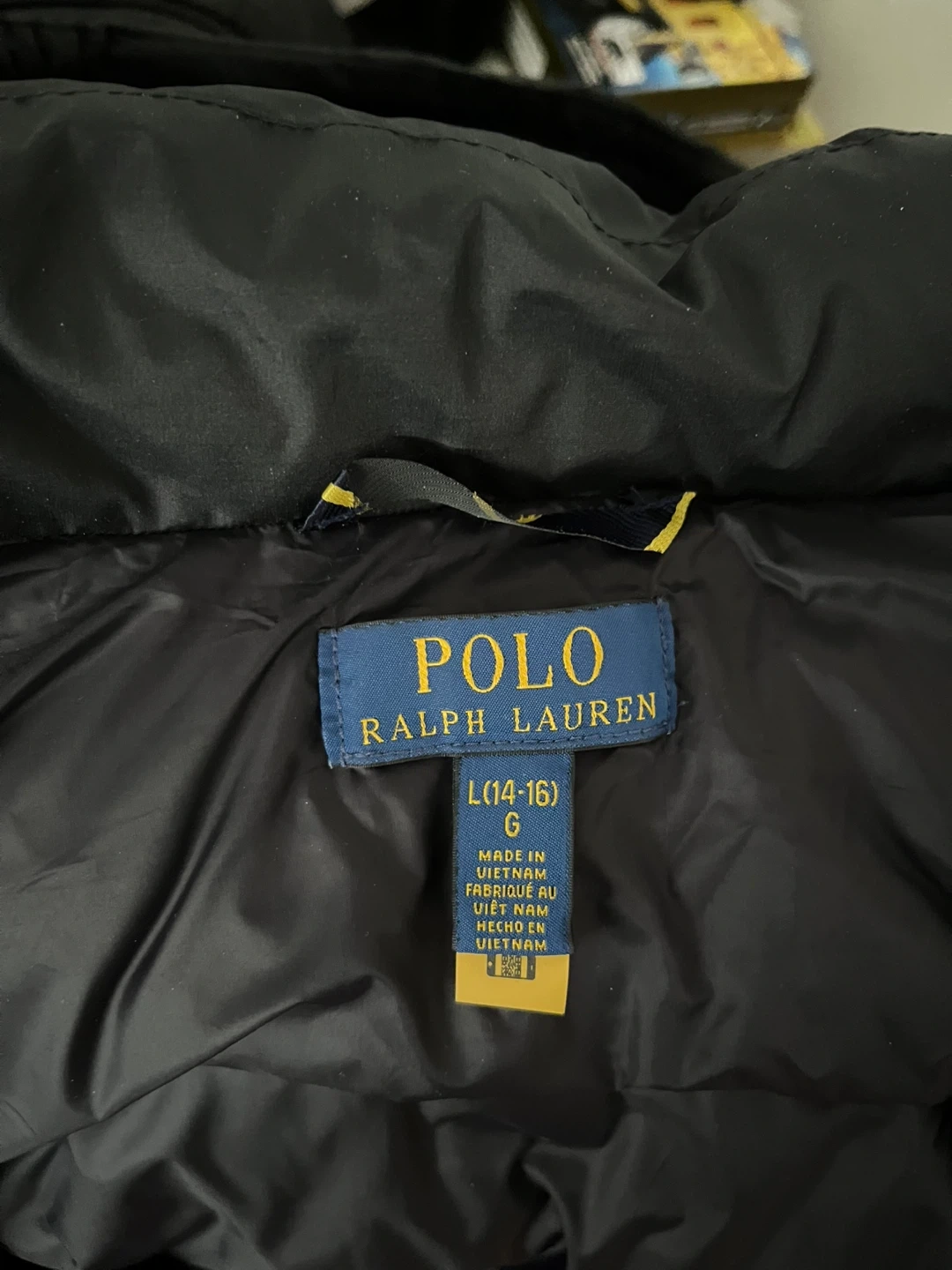 Ralph Lauren puffer jacket in black with a hood. The label says boys size 14 to 16 but my son grew out of it when he was 12. It is in excellent condition and is a very high-quality jacket. Purchased for over $200, selling for $70.