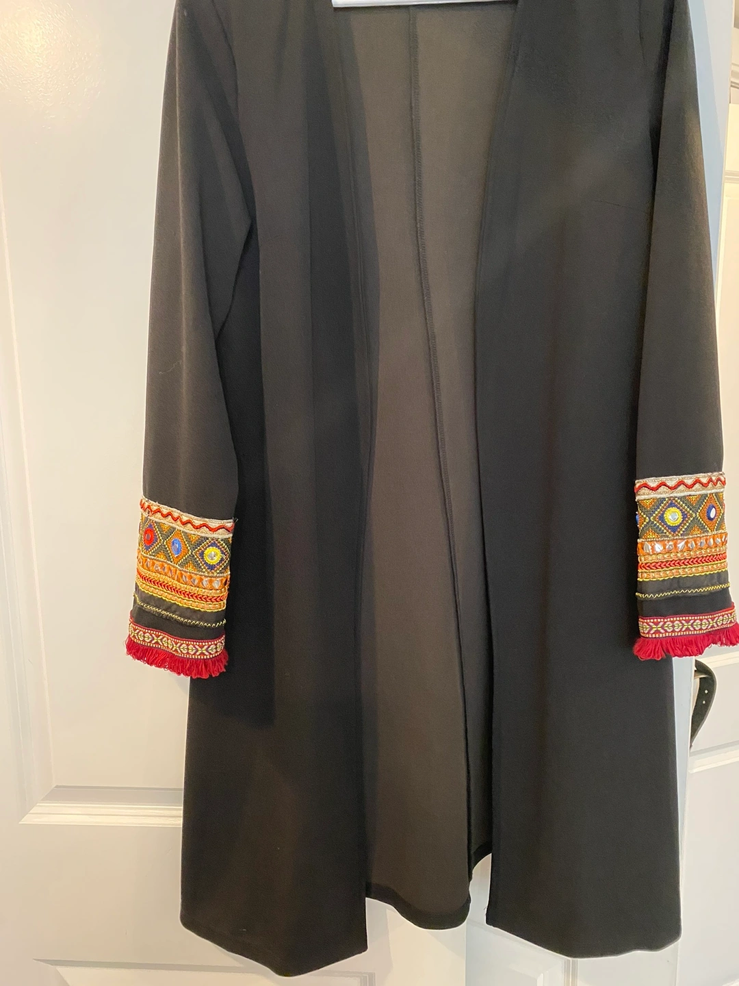 218A black cardigan with colourful embroidery detail on the cuffs. The cardigan is open front. It has a long, loose fit. The cuffs feature colourful embroidery and beads. The cardigan is lined.