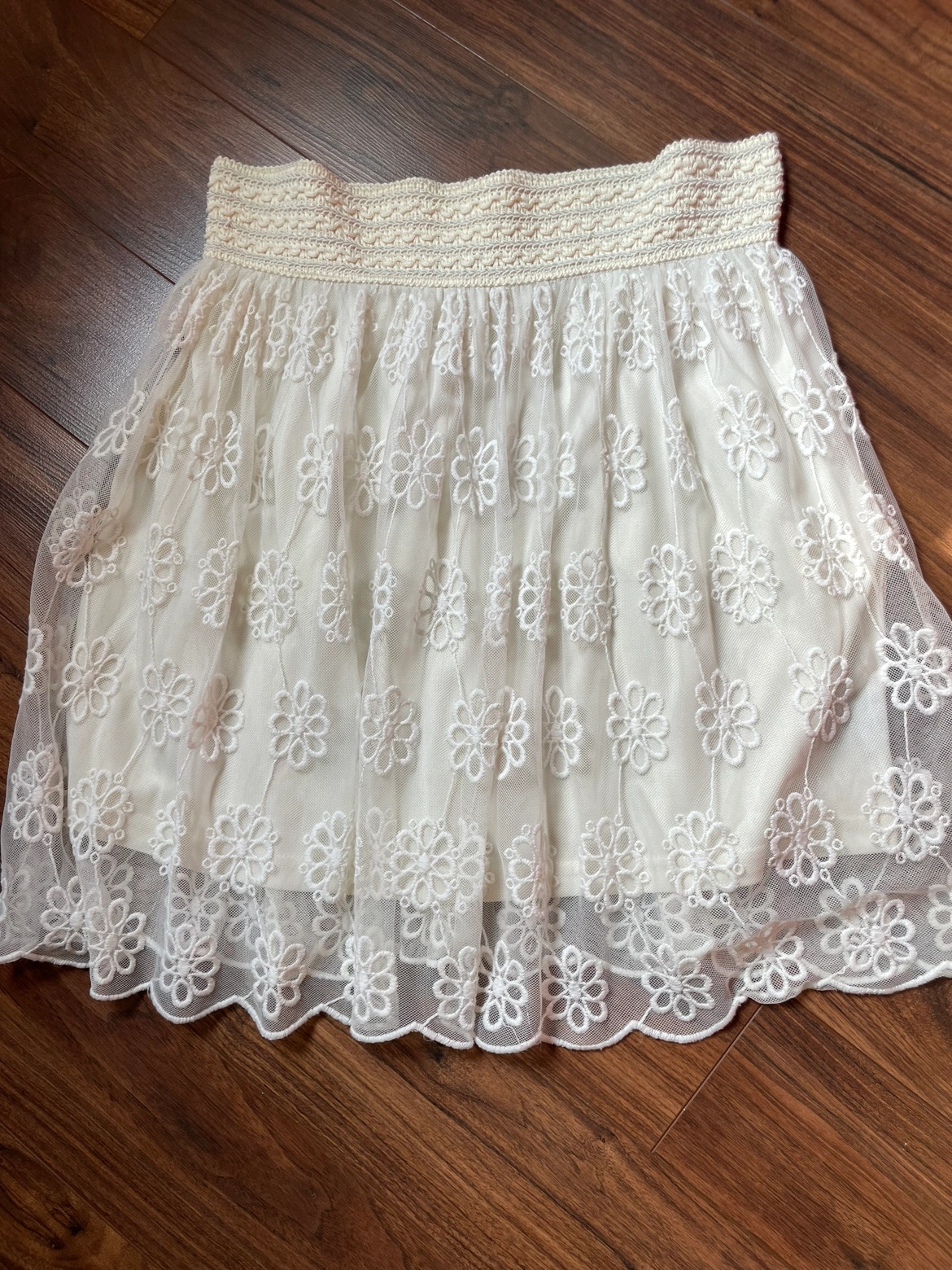 This is a white lace skirt with a crochet waistband. The skirt is semi-sheer with floral detailing. It is a casual and comfortable piece that can be dressed up or down.