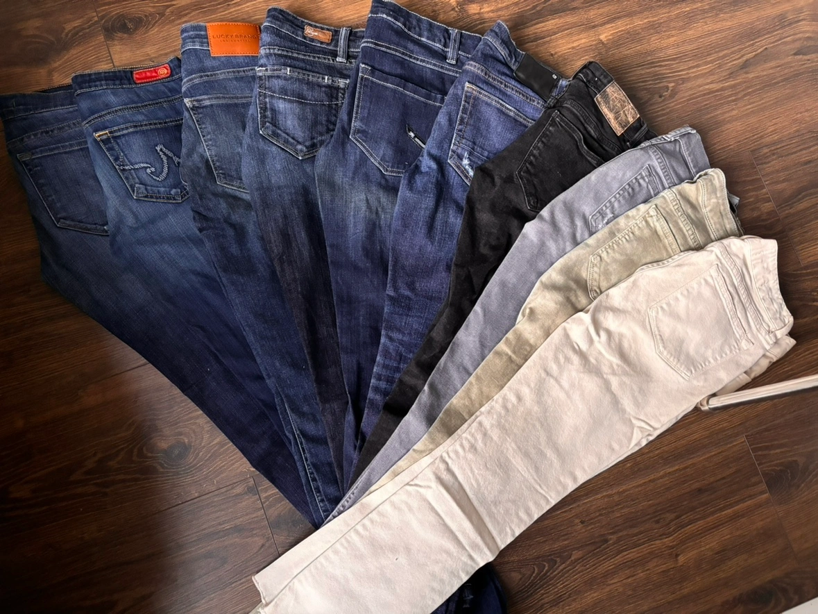 All 10 slim crop ankle length low rise jeans: 1 JBrand medium wash; 1 AG medium-dark wash; 1 Lucky Brand medium-dark wash; 1 Paige dark denim; 1 Parasuco dark wash; 1 Zara dark slightly distressed denim; 1 Zara black wash; ; 1 Zara grey distressed wash; 1 Zara light khaki olive wash; 1 JCrew ecru denim — average size 00 XS 24” waist 28” inseam zip fly