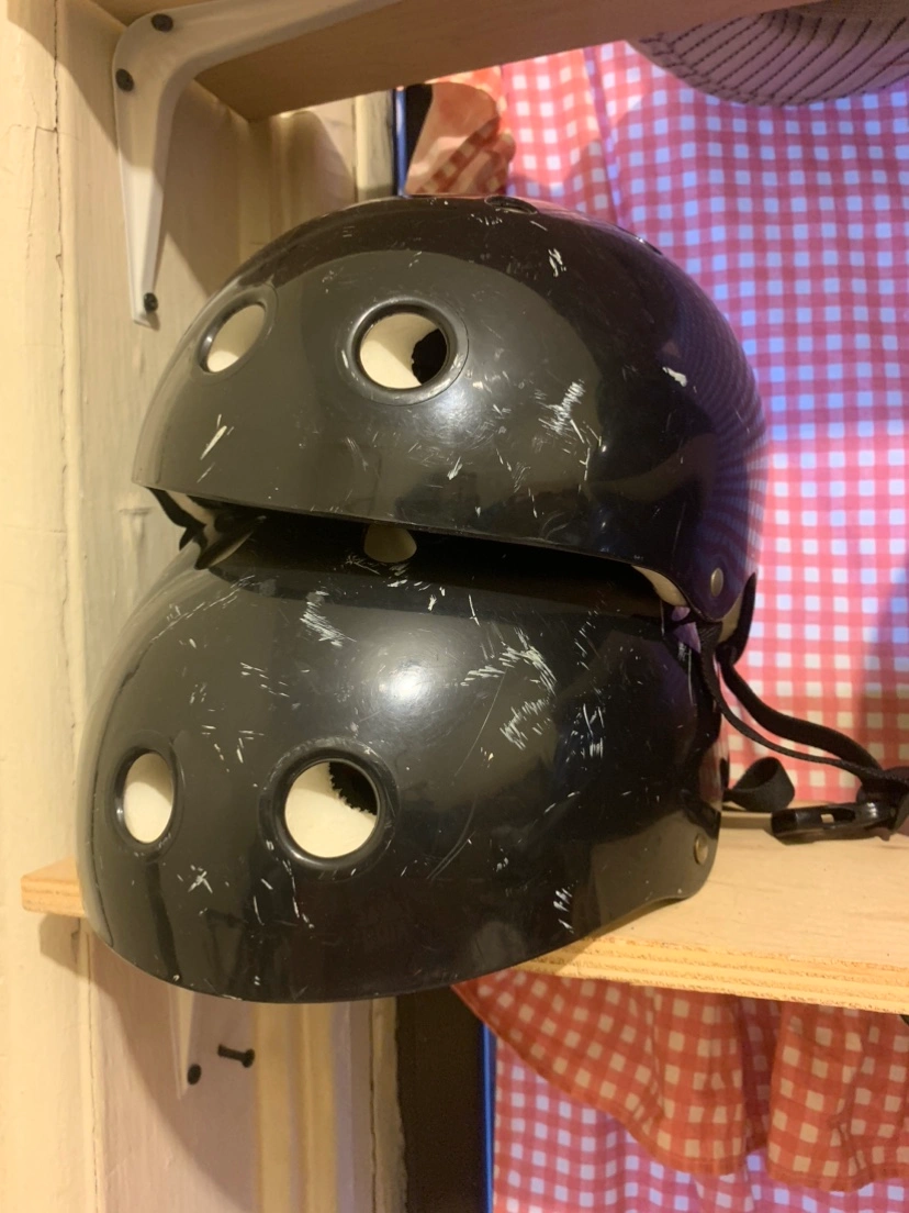 Black skateboard helmet with vent holes. This helmet has some scratches and lot of wear. It comes with a chin strap.