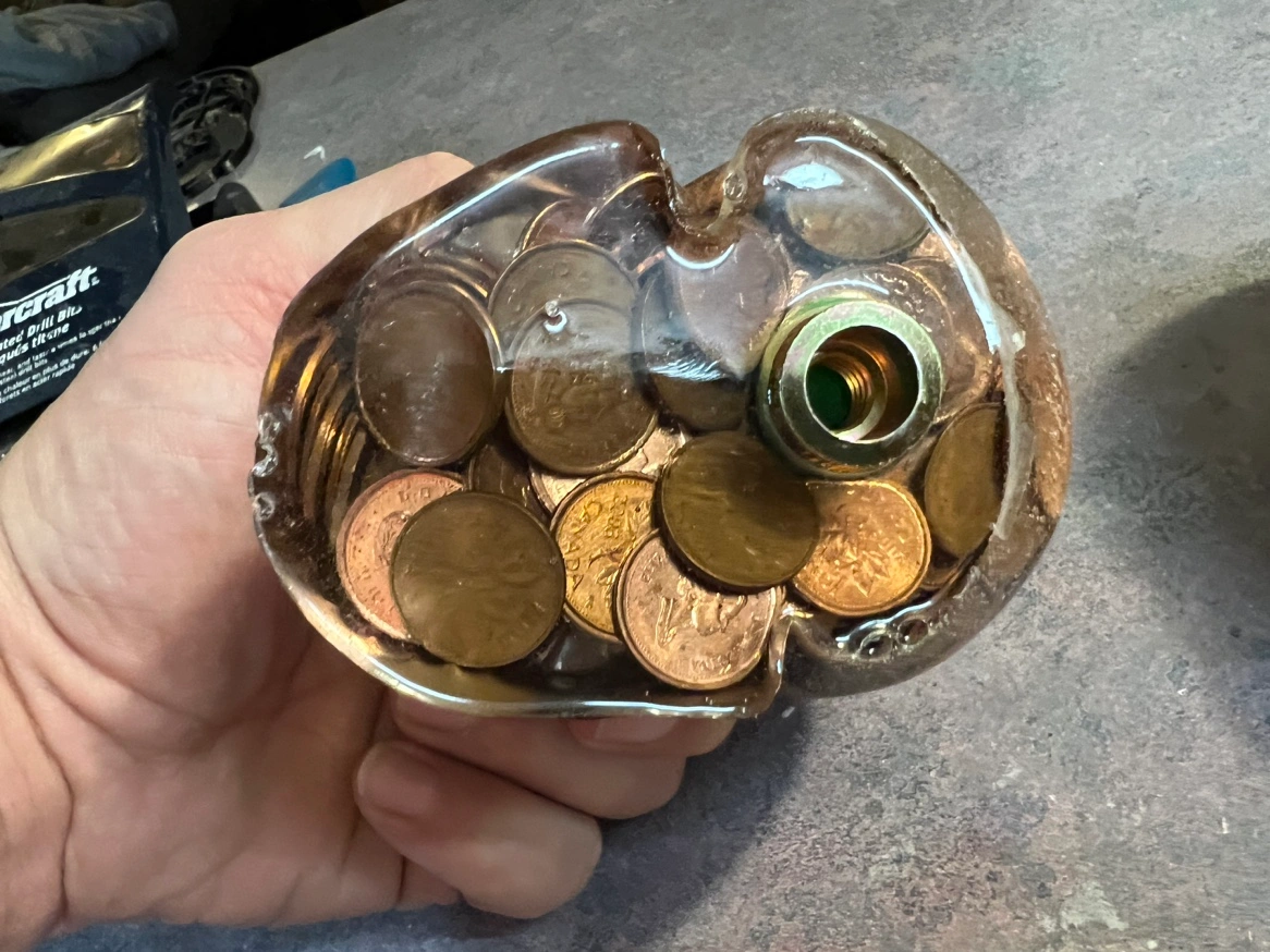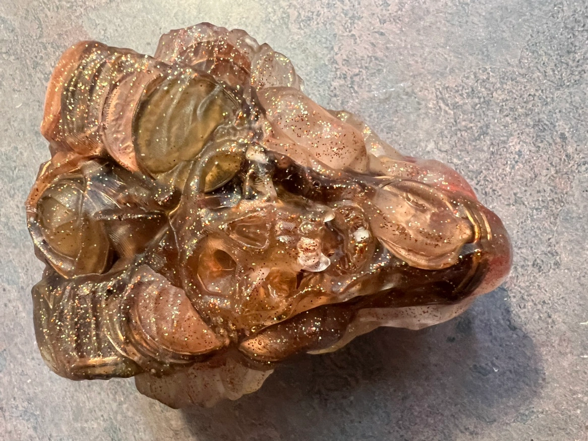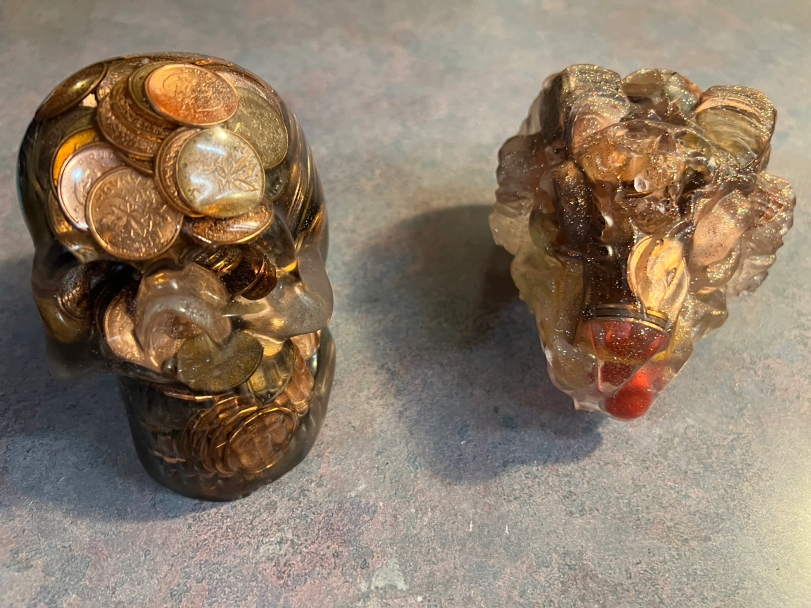 Two resin sculptures, one of a skull and one of a hot dog. Both are filled with coins and glitter. The hot dog is on a bun and has mustard and relish. $25 each.
