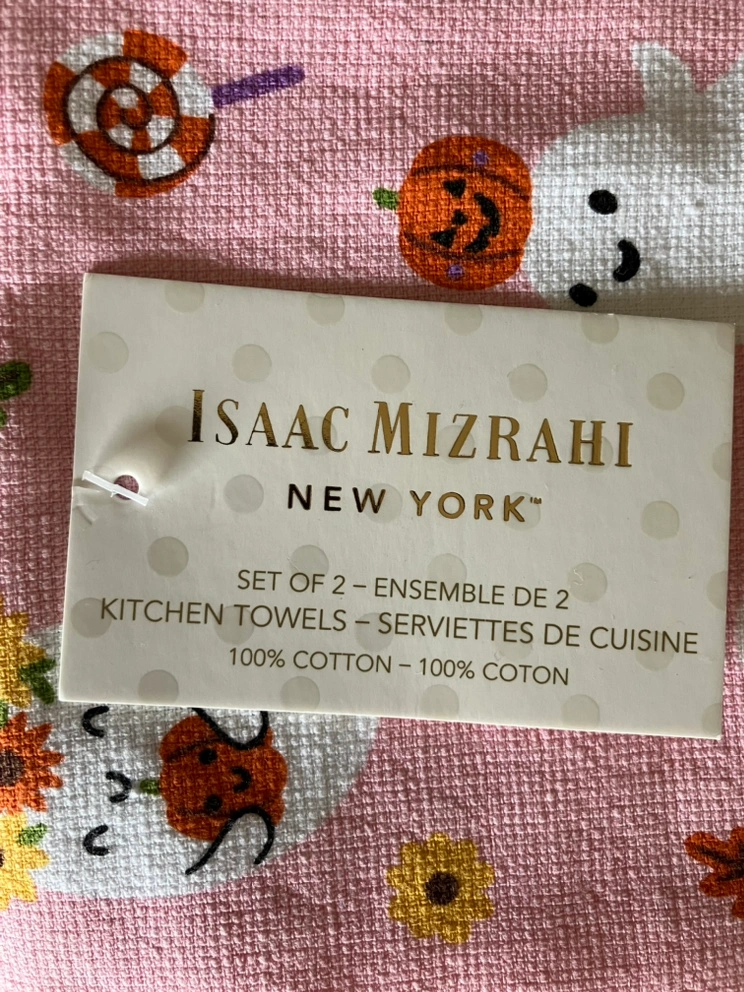 NWT Isaac Mizrahi pink Halloween 2 piece towel set featuring ghosts, goblins, pumpkins, witch, candy, BOO and all things festive for Halloween!