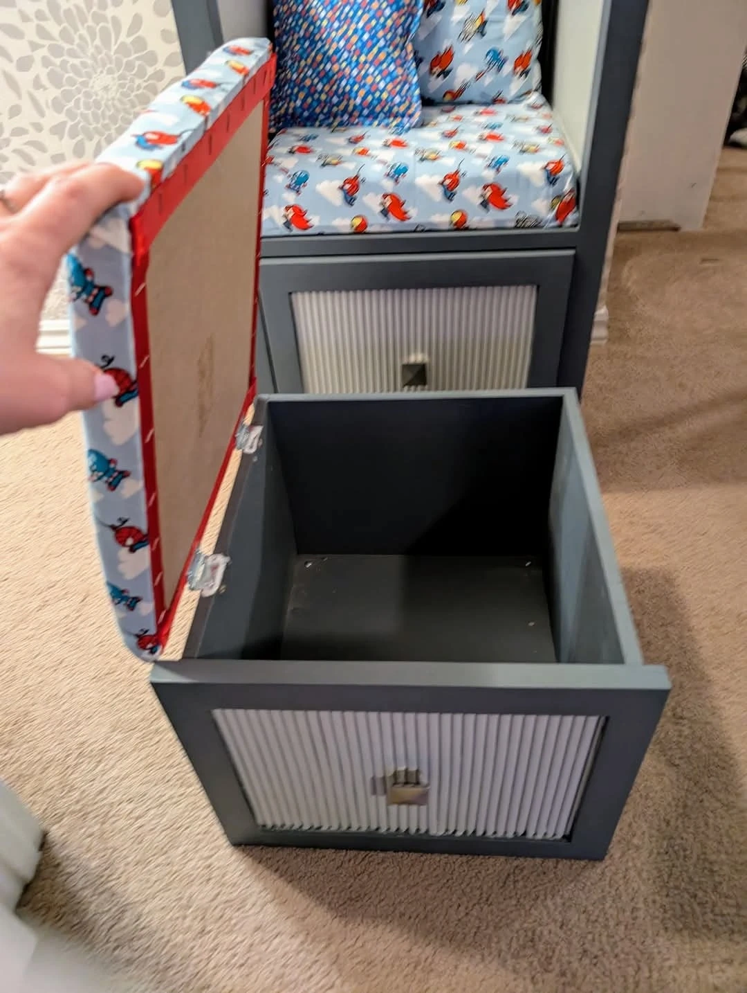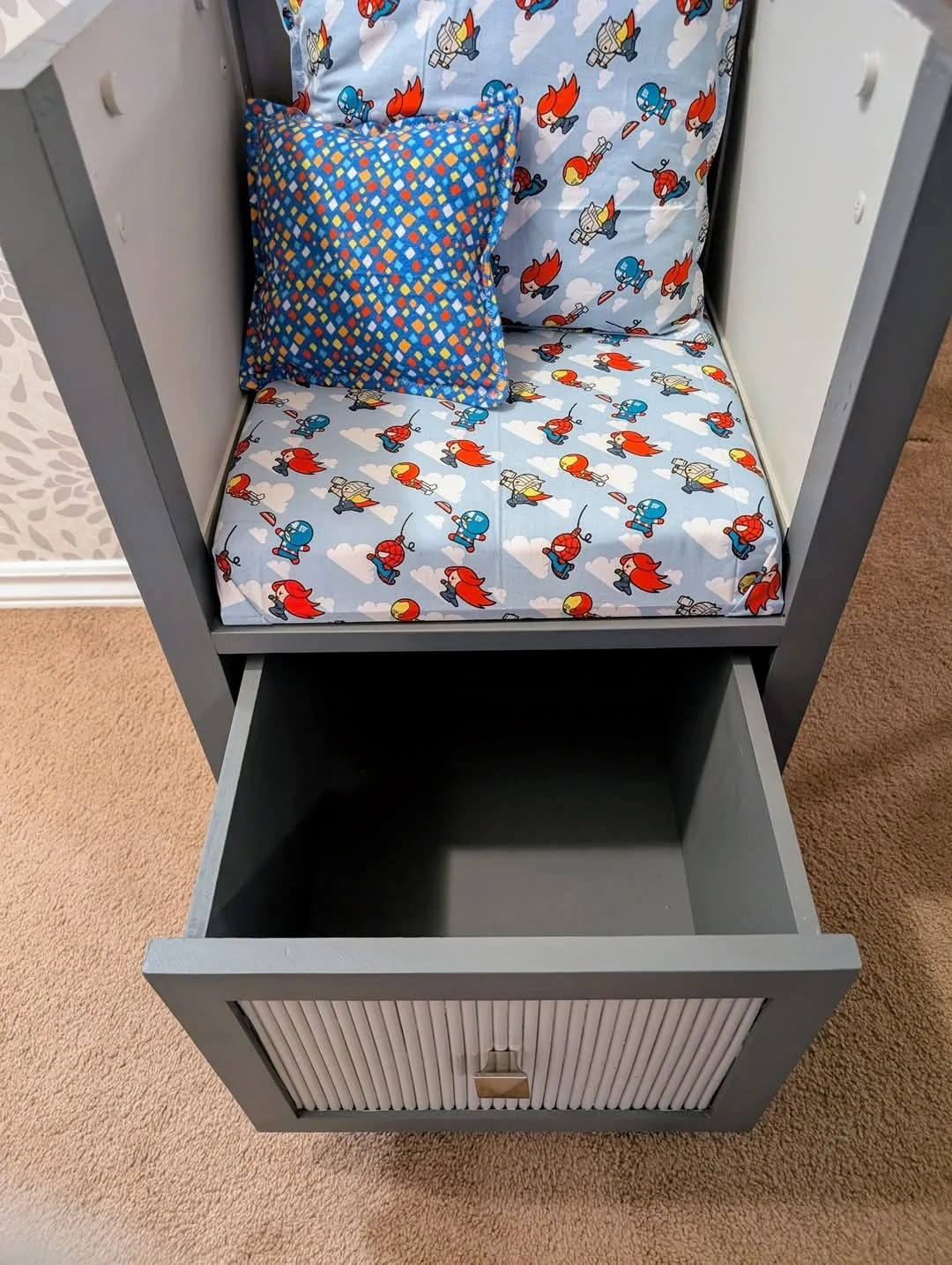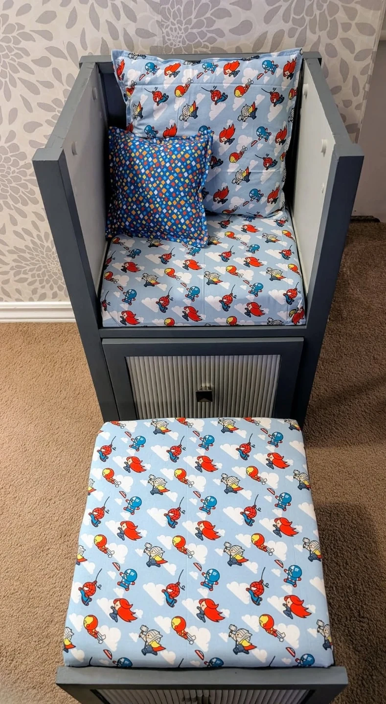 This grey reading nook chair features a fun superhero print fabric on the seat, back cushion, and ottoman. It includes a lift-top storage ottoman and a drawer for extra organization. Perfect for a child's bedroom or playroom!