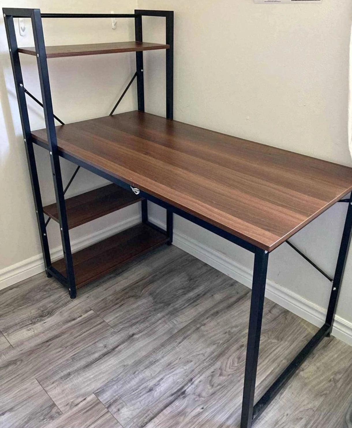 A computer desk with shelves, in brown wood and black metal. It has a large desk surface with shelves on the side and above. It is great for a home office or for studying.