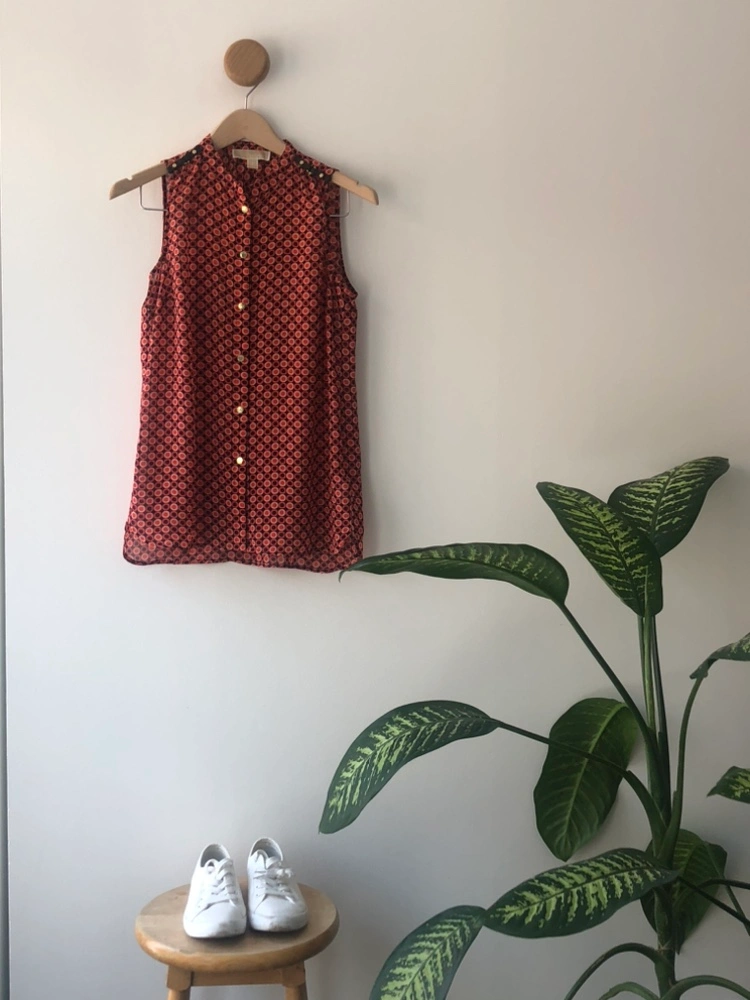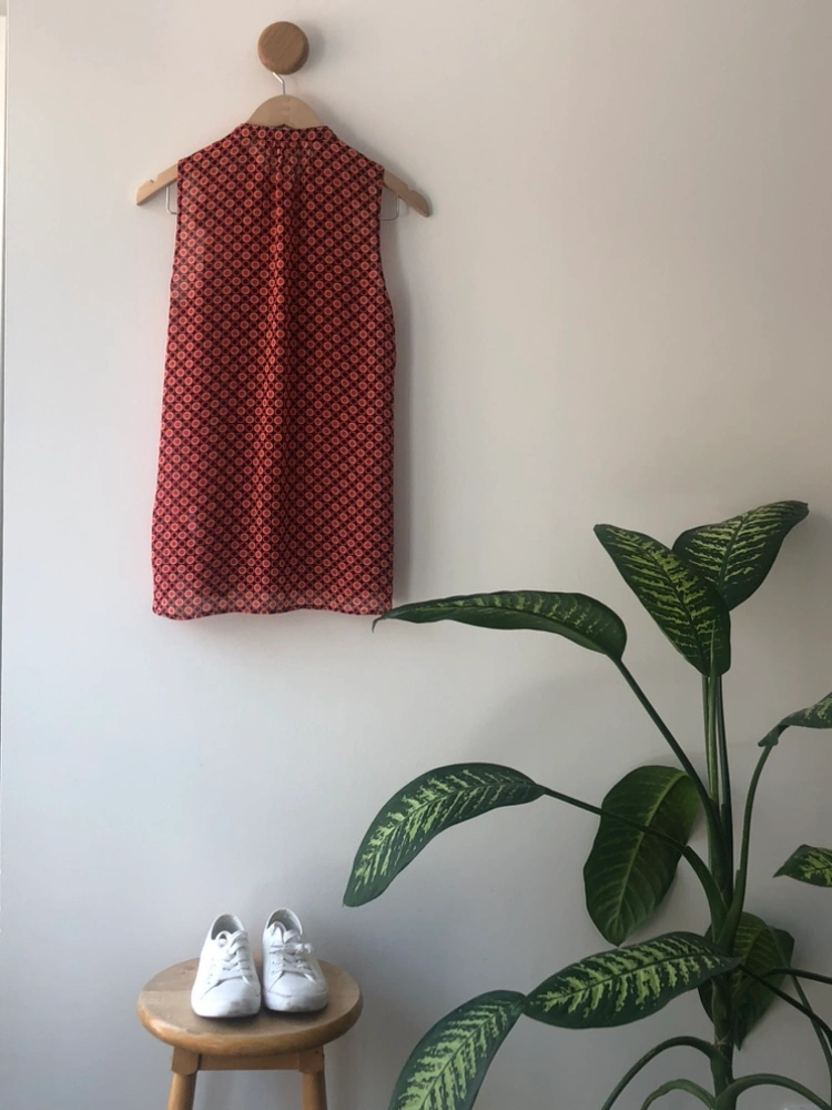 Originally $149. Sleeveless tank with snap buttons. Coral, pink, dark navy circle print, retro yet modern look. Leather strap details on shoulder with gold colour hardware. Part of the spring/summer collection.